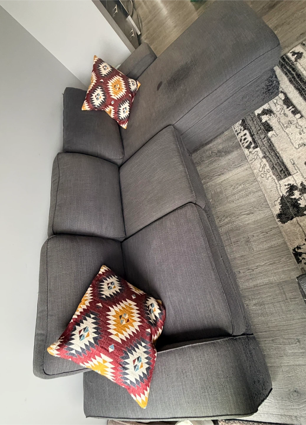Selling a comfy grey sectional sofa! It's great for lounging and fits well in any living space. There are some signs of wear and tear, as you can see in the pictures.