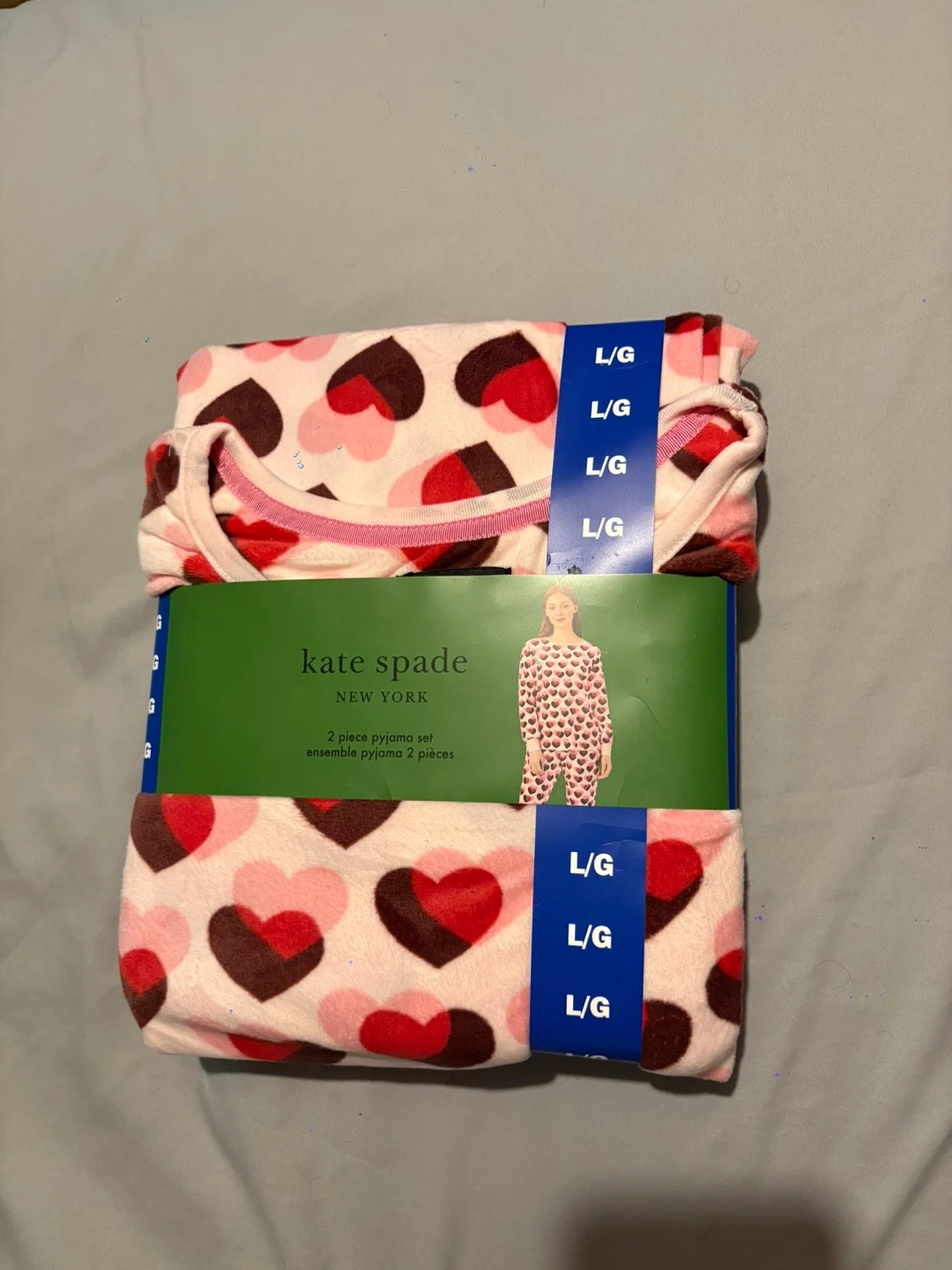 Kate Spade New York 2-piece pajama set! The set features a cute heart pattern on a soft, plush material. It's a size Large (L) and comes in its original packaging! Brand new!