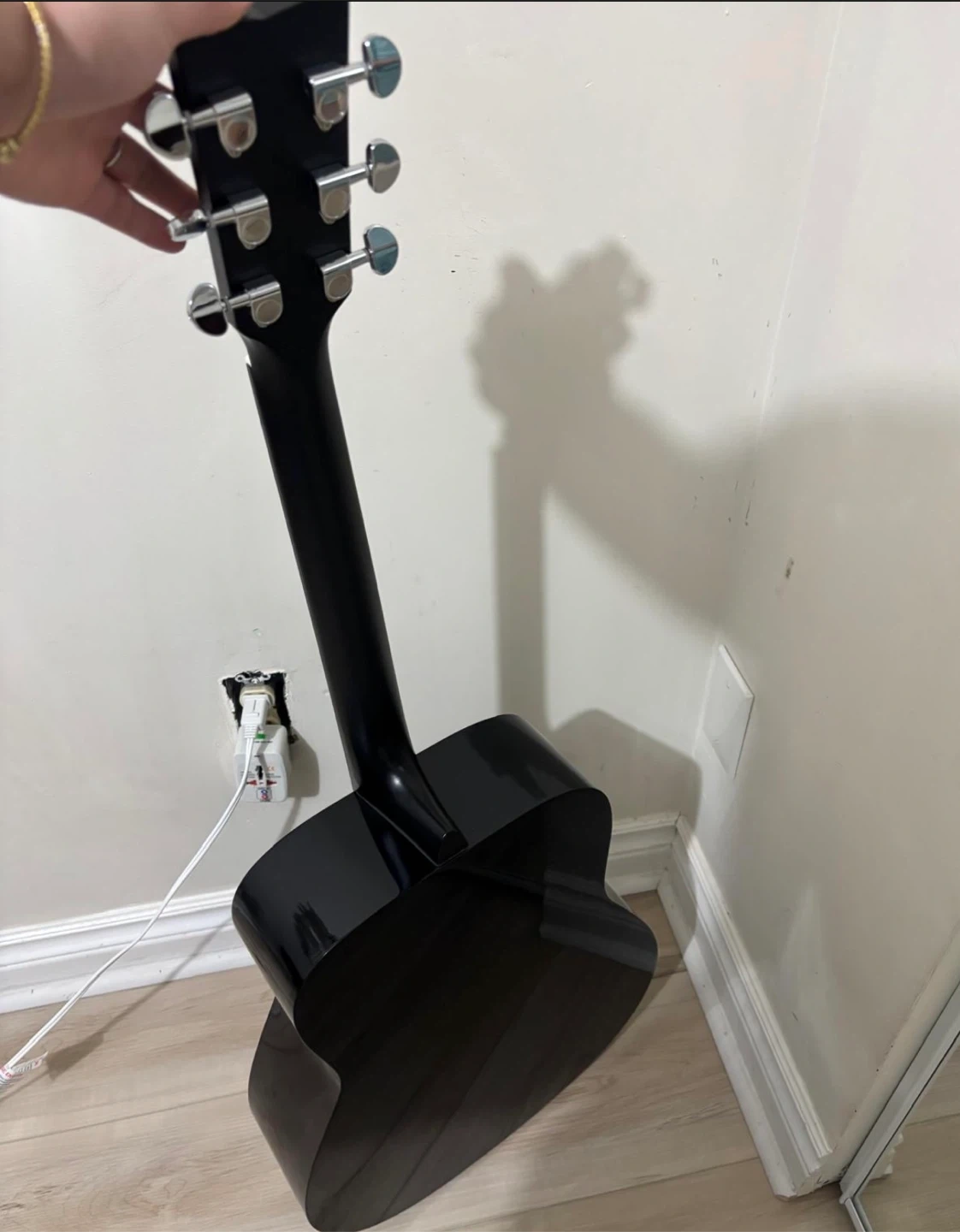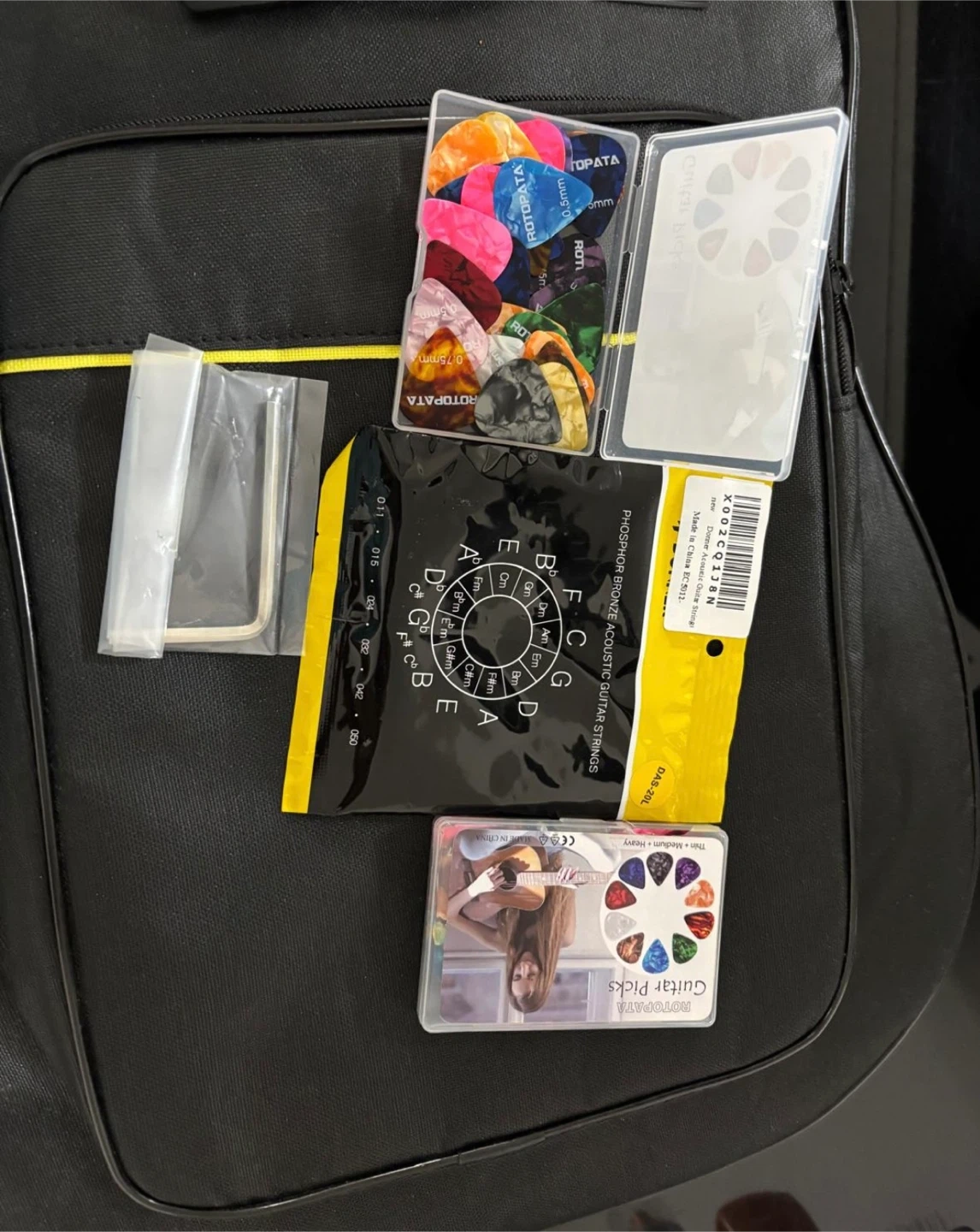 Selling a Yamaha acoustic guitar in black! It comes with a case and some accessories, including guitar picks and strings. Great for beginners or anyone looking for a reliable acoustic guitar