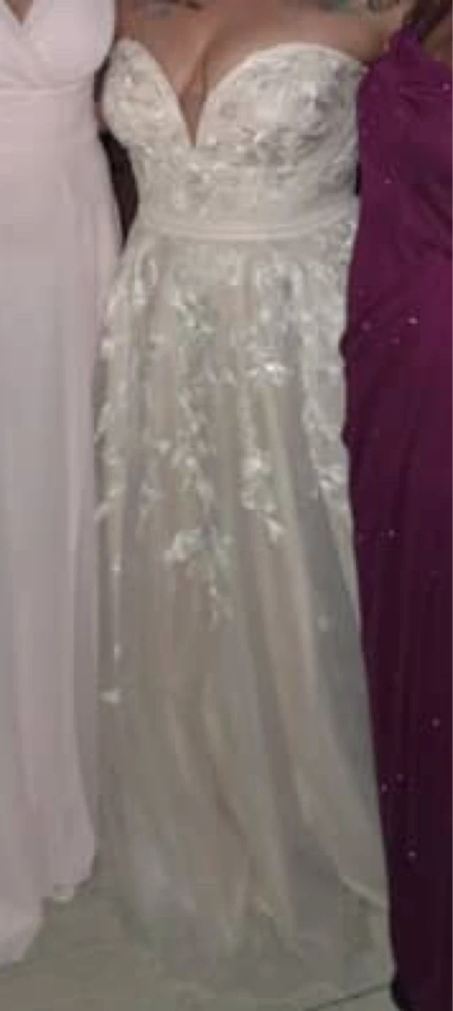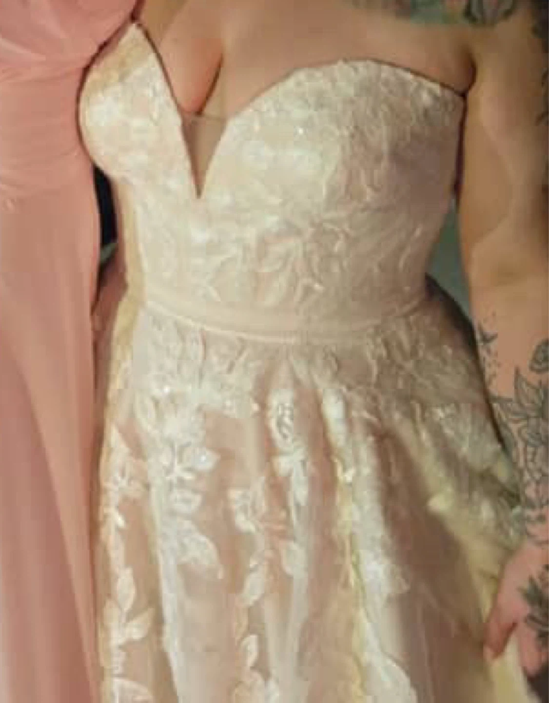 Selling a beautiful wedding dress with floral lace detailing. It's in great condition and ready for its next special day!
