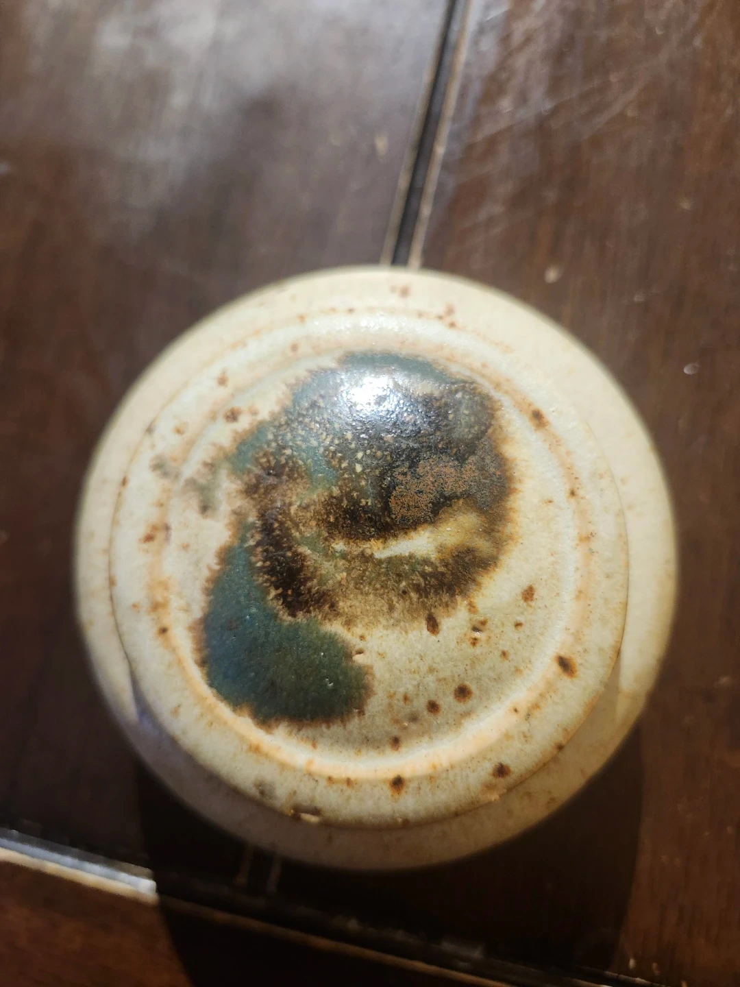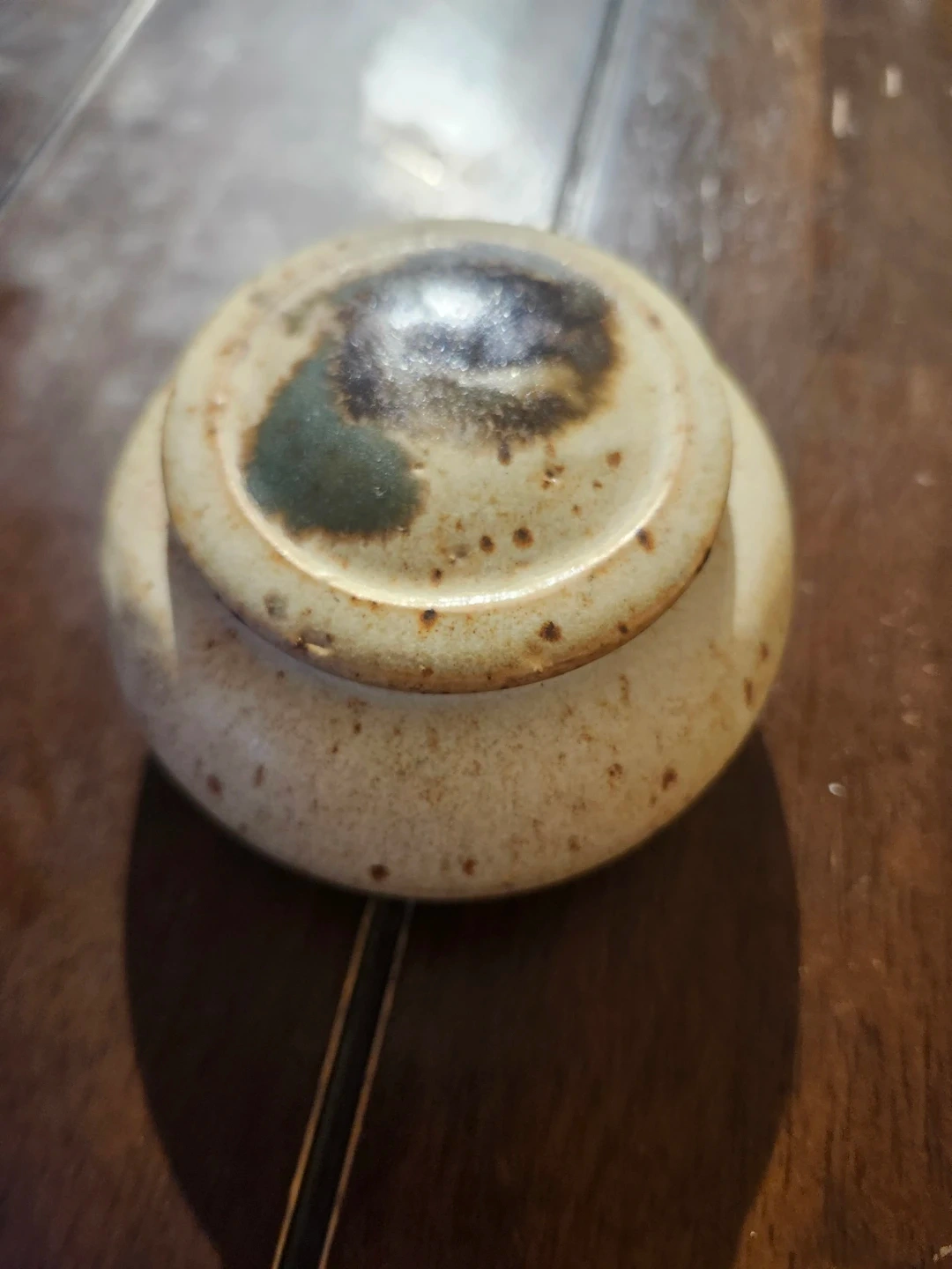 Here's a cute little ceramic jar with a lid! It has a speckled pattern and a unique design on the lid. It's perfect for storing small items or just as a decorative piece.