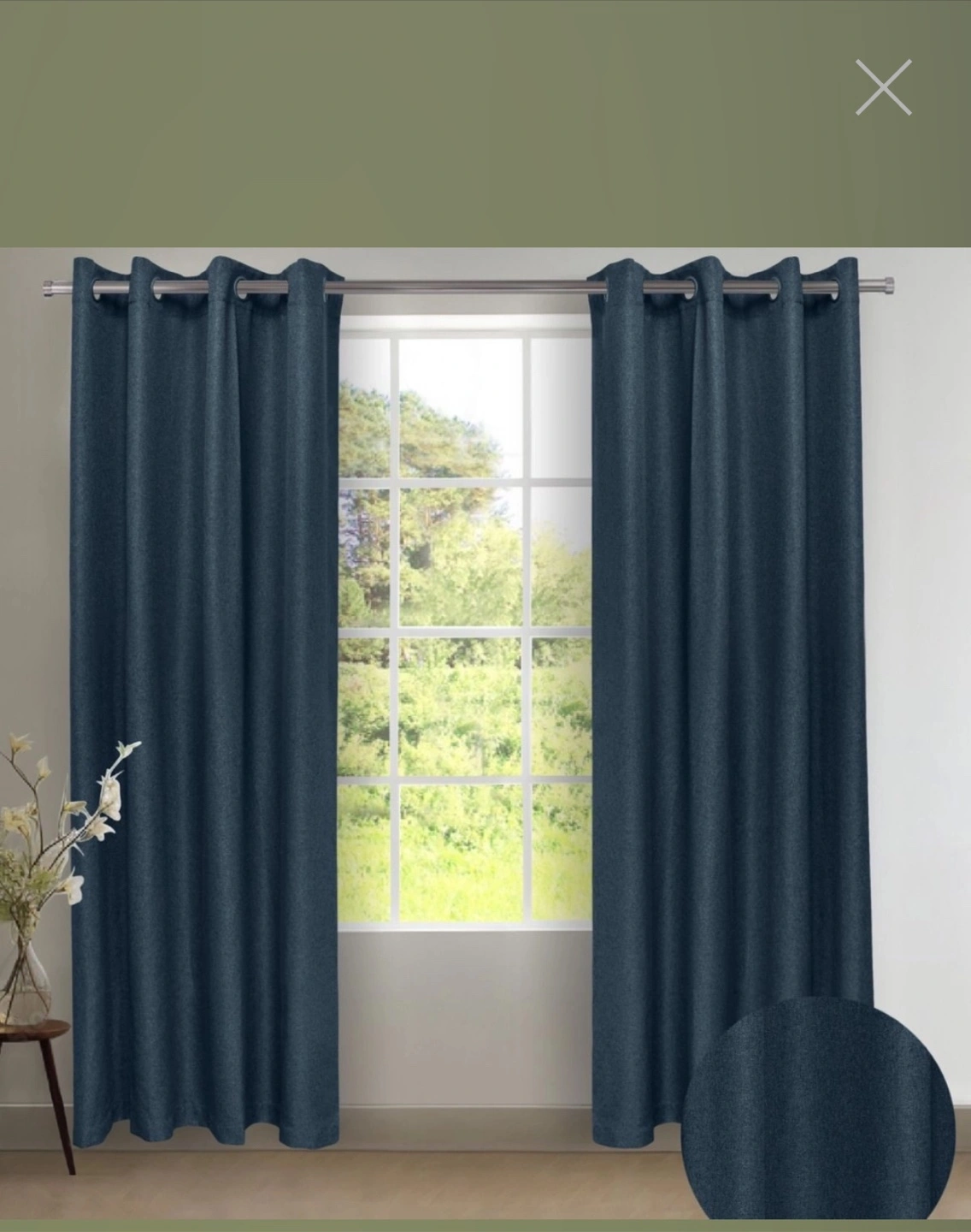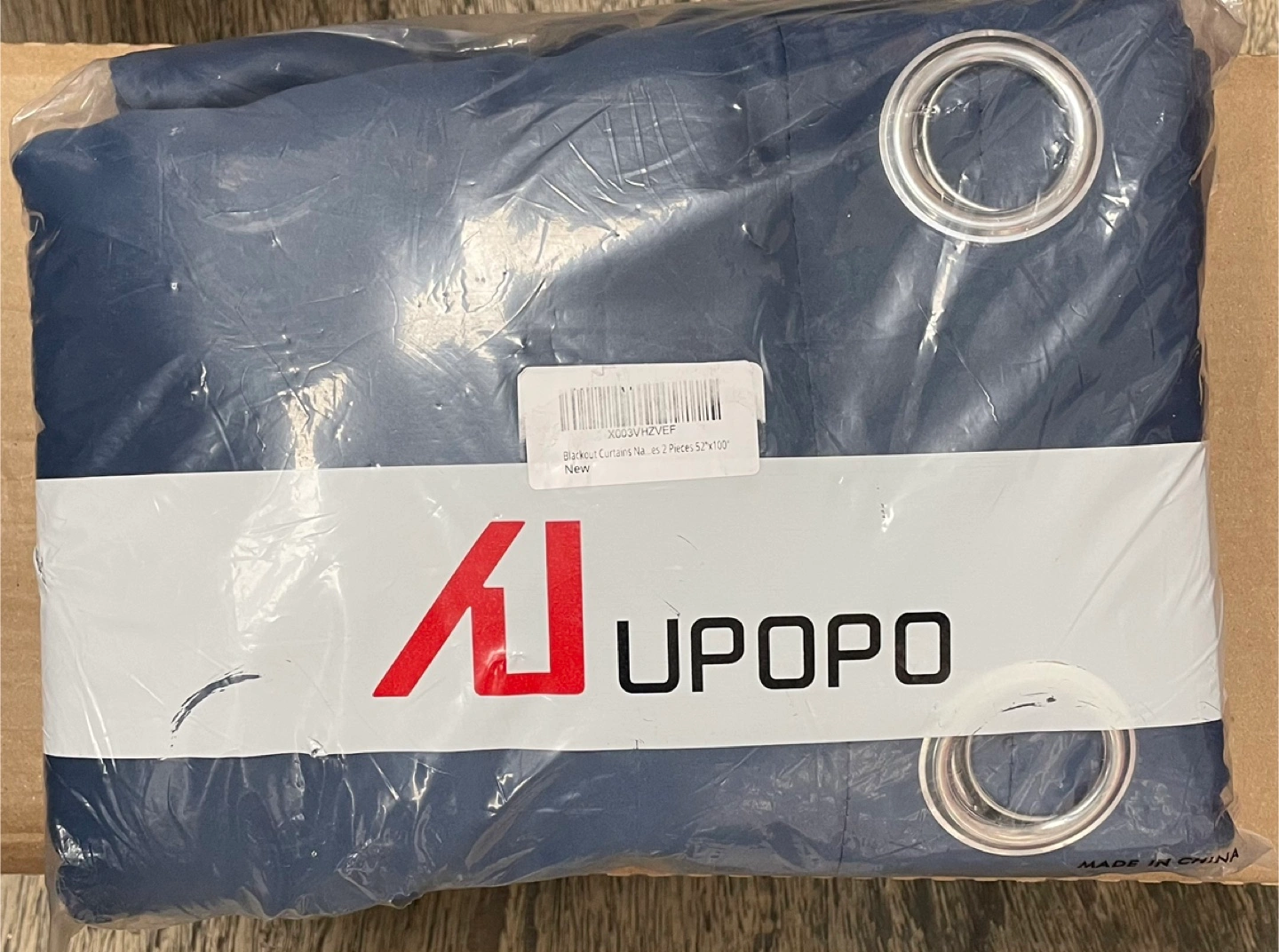 These blackout curtains are light navy blue and measure 52"x100". They feature silver grommets and are made with a front layer, black yarn, and back layer. They're designed for room darkening, thermal insulation, and noise reduction, and are soft and durable