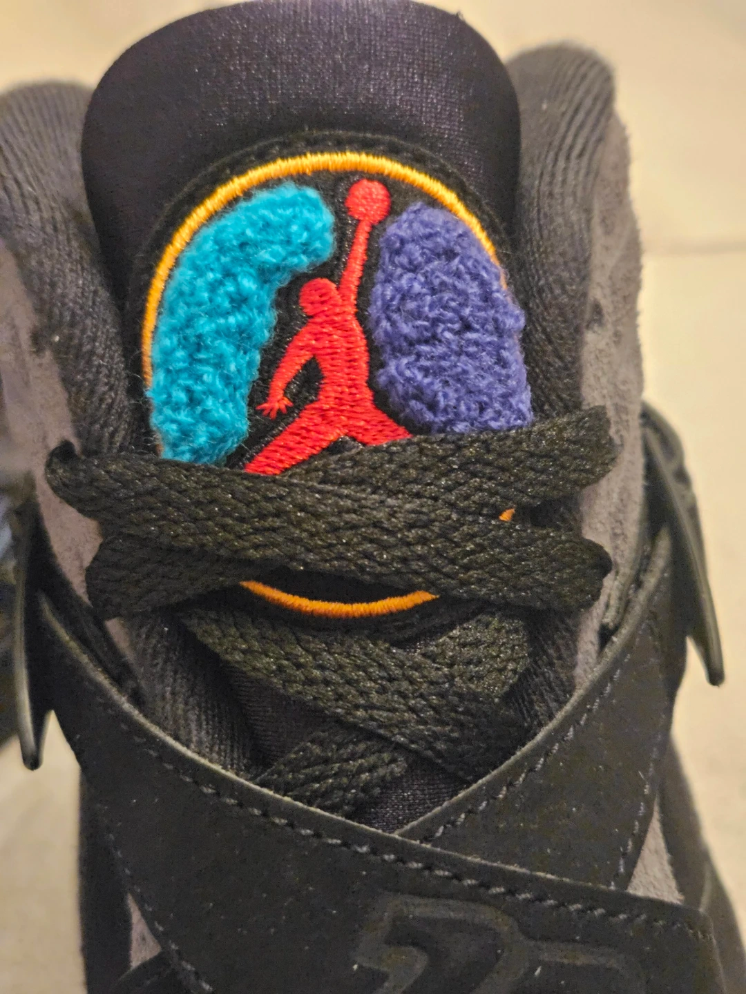Selling a pair of brand new Air Jordan 8 Retro basketball shoes! These stylish high-tops feature a black, grey, and blue colourway with the iconic Jumpman logo on the tongue. Perfect for basketball or casual wear. Comes with the original box!