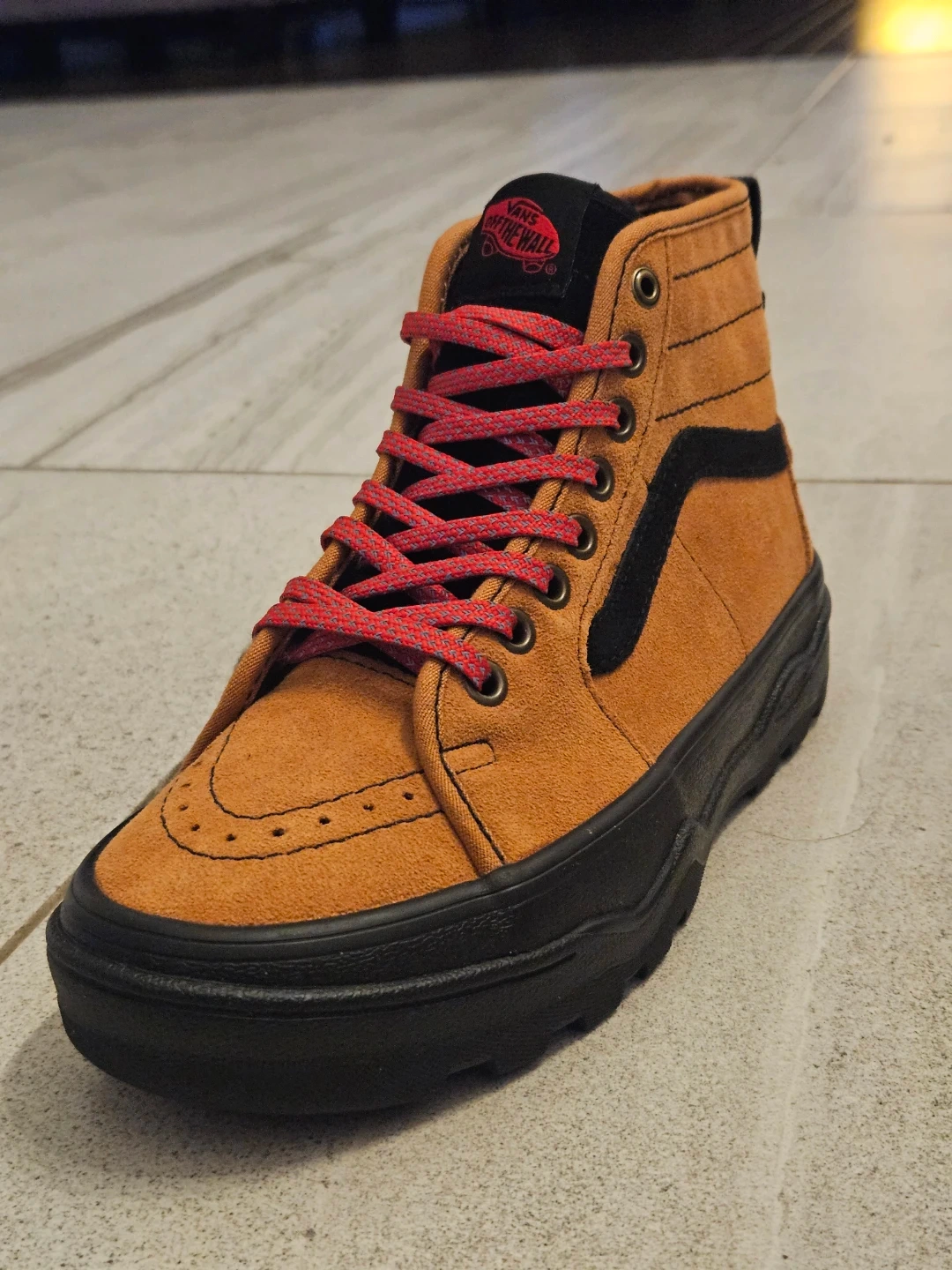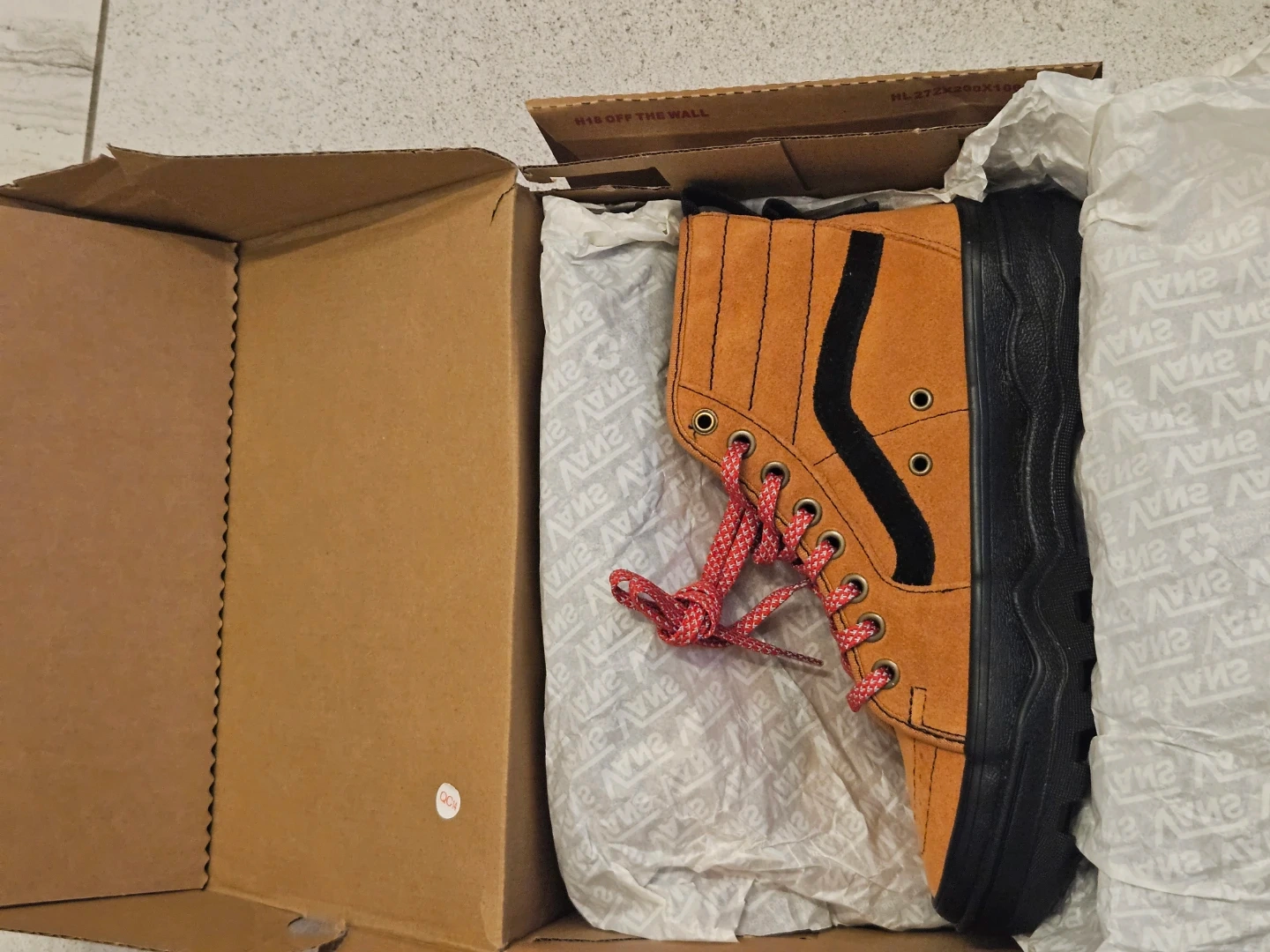 Selling a pair of brand new Vans high top suede boots in a tan and black colourway. These are perfect for colder weather. They have a durable construction and a lugged outsole for added traction. The box is included!