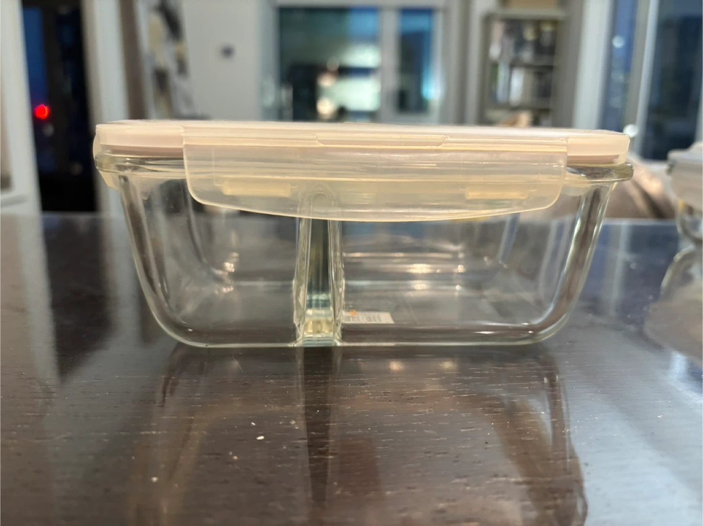 Selling a glass food container with a clear lid. It has a divider inside, perfect for keeping your snacks or leftovers separate. Great for meal prepping or storing food in the fridge!