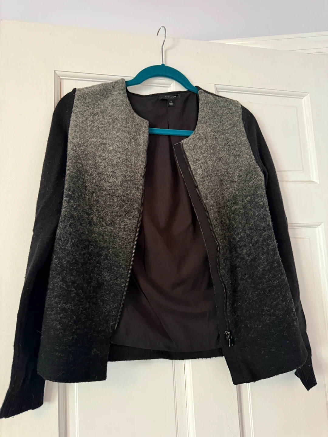 Selling an Ann Taylor jacket in size small! It features a stylish ombre design, blending from gray to black. The jacket is made from a cozy wool blend, perfect for adding a touch of warmth and sophistication to any outfit