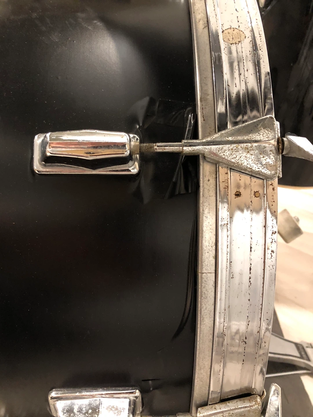 Bass drum: 10 lug, oversized 24” width, shallow 15” deep. I’m guessing it’s Ludwig from the 70’s… but can’t tell from the wrap.