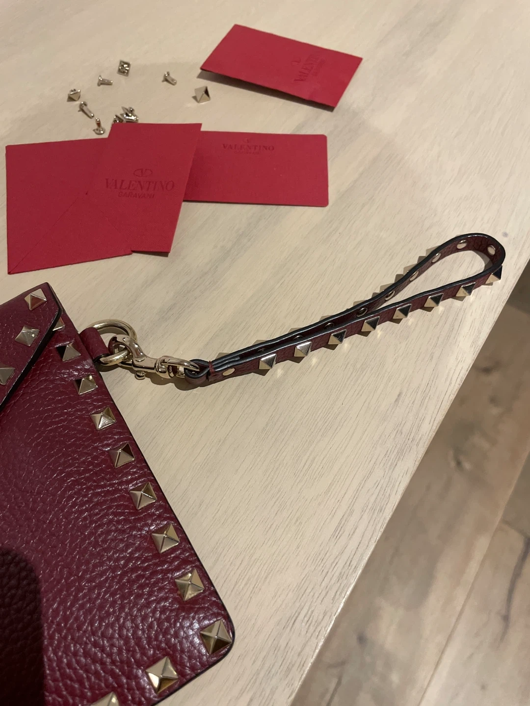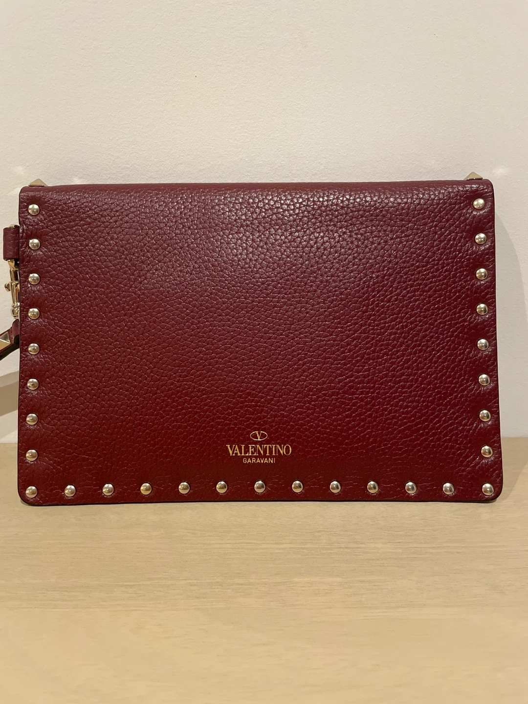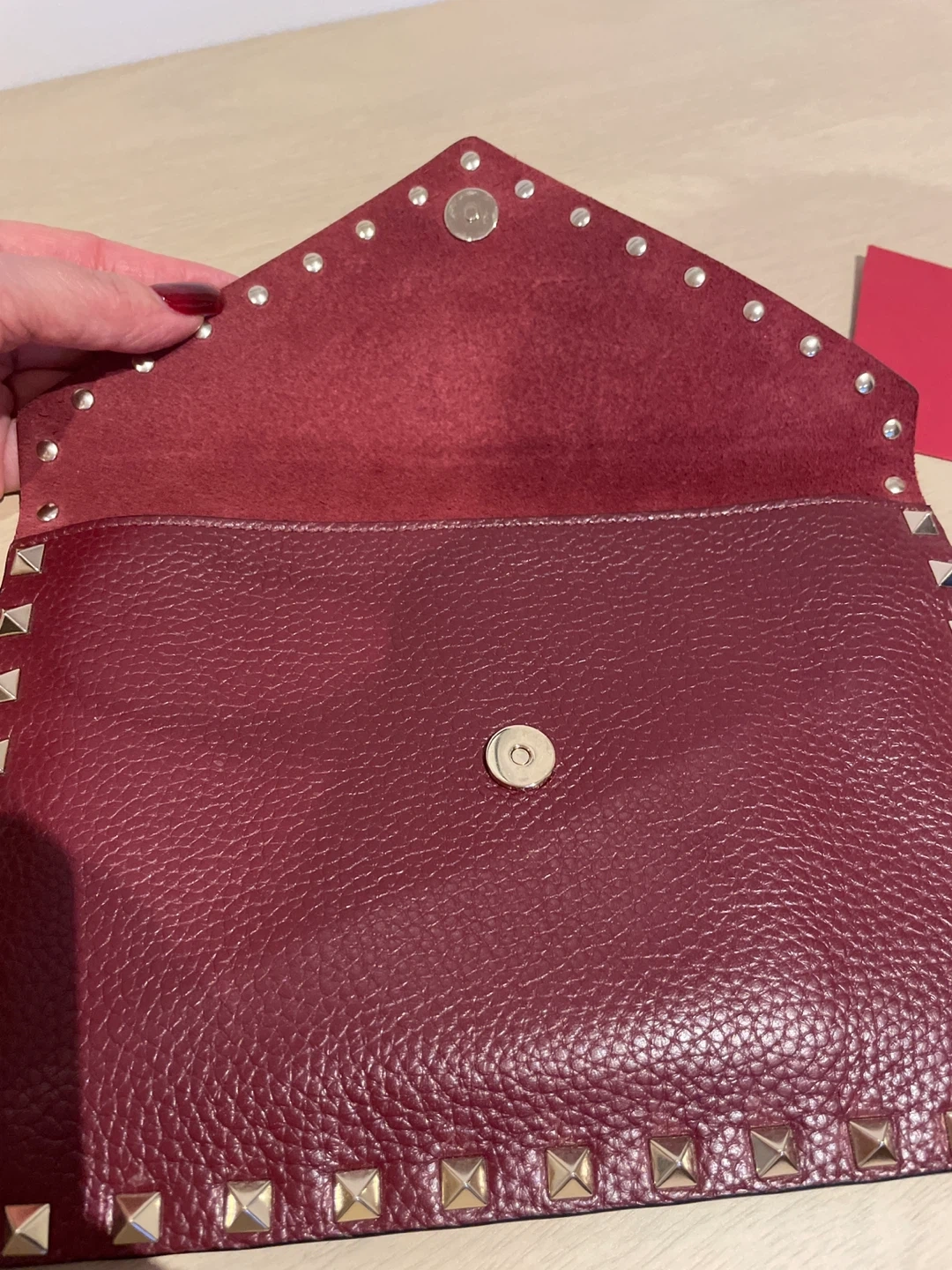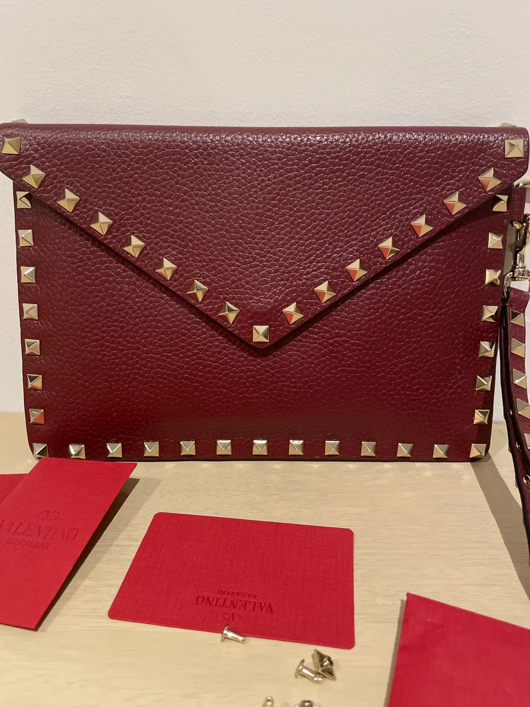Selling a Valentino Garavani red wine studded clutch. It's in used excellent condition. Comes with the cards and extra studs as pictured!
