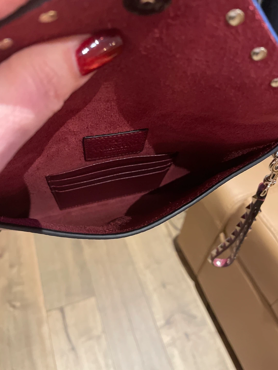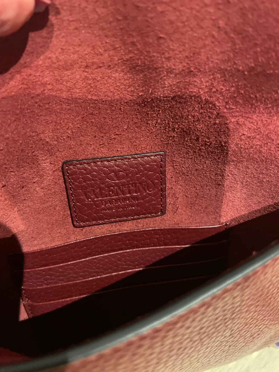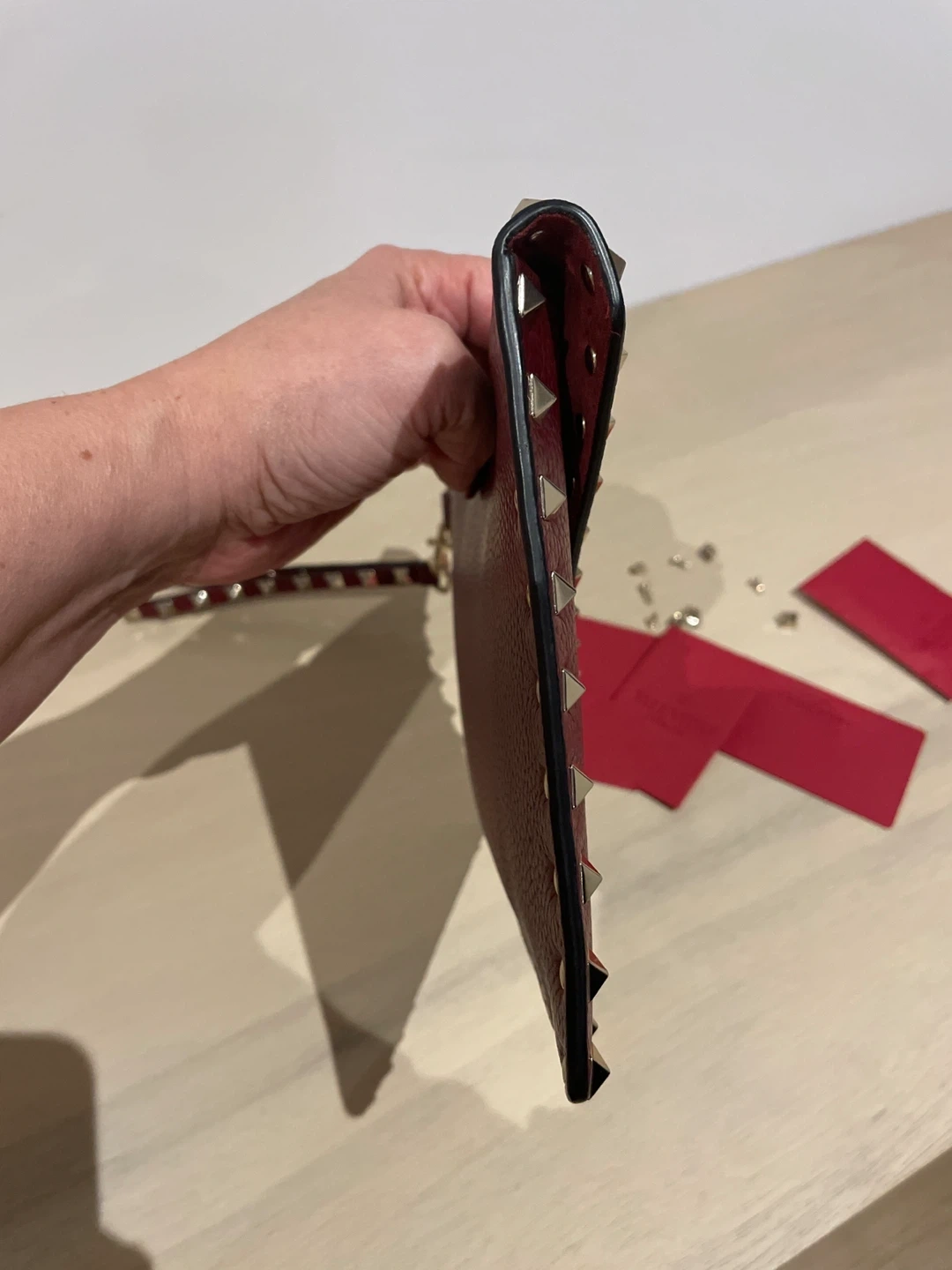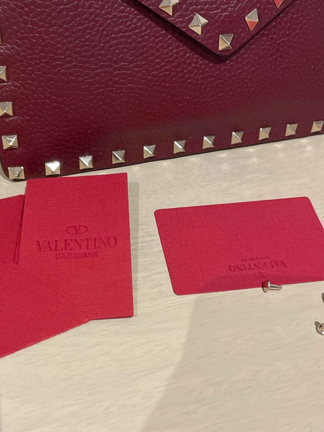 Selling a Valentino Garavani red wine studded clutch. It's in used excellent condition. Comes with the cards and extra studs as pictured!