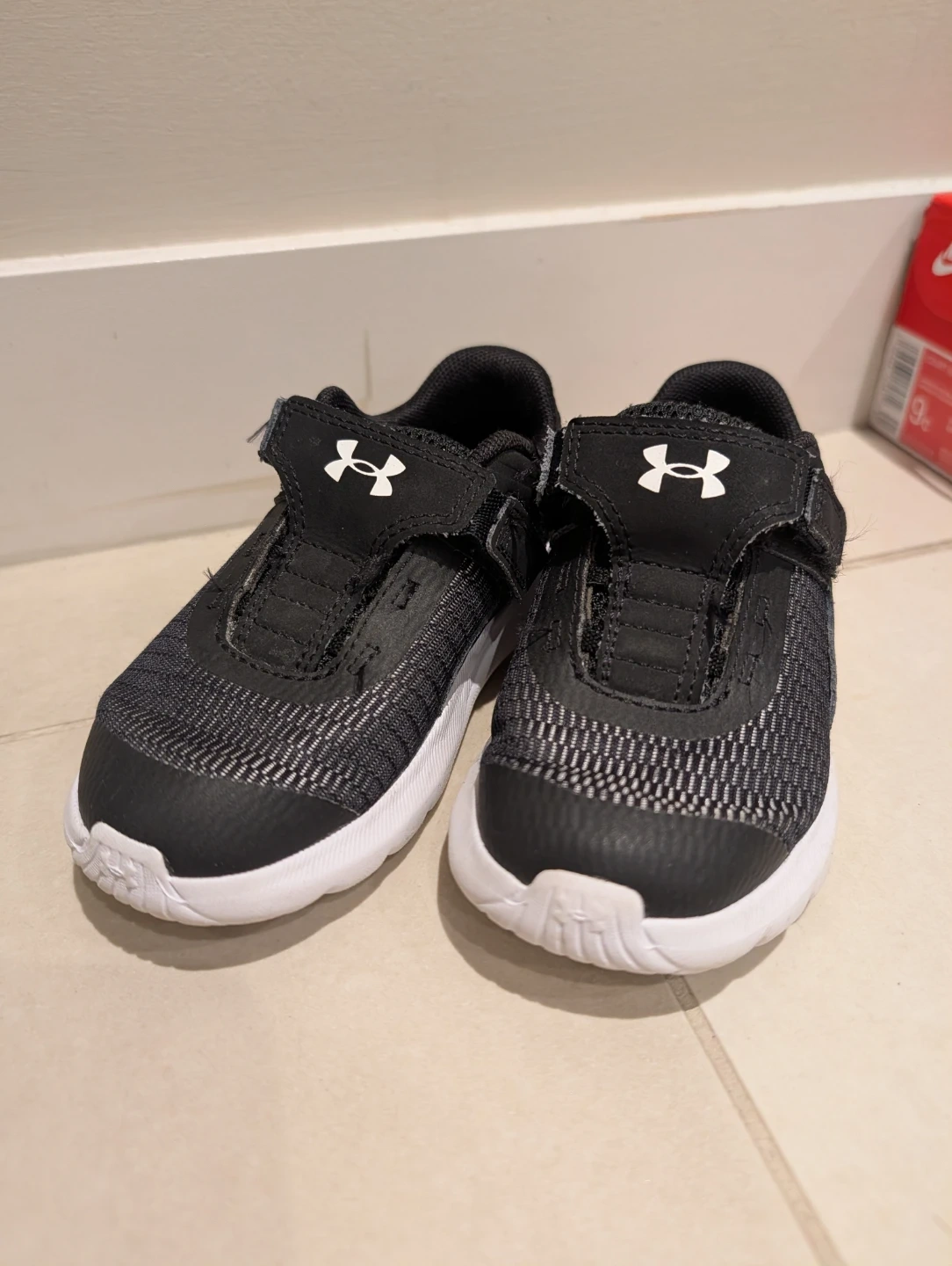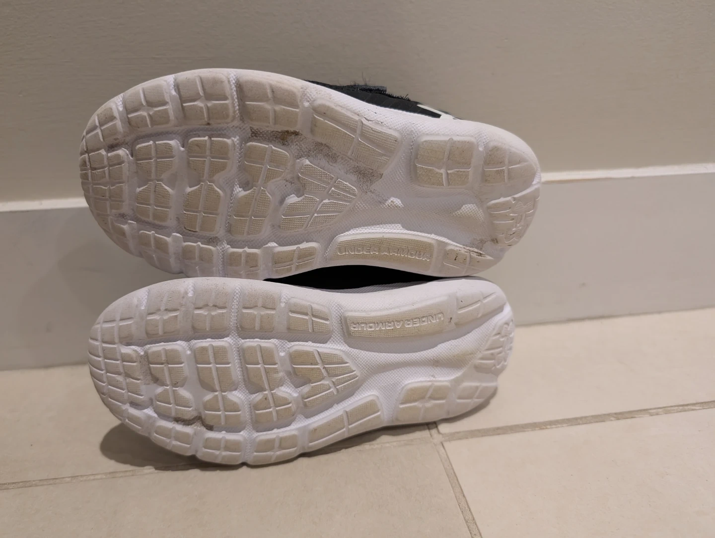 Selling a pair of Under Armour kids' shoes in size 6. They are black and white. They have been worn, as you can see from the soles, but still have lots of life left in them!