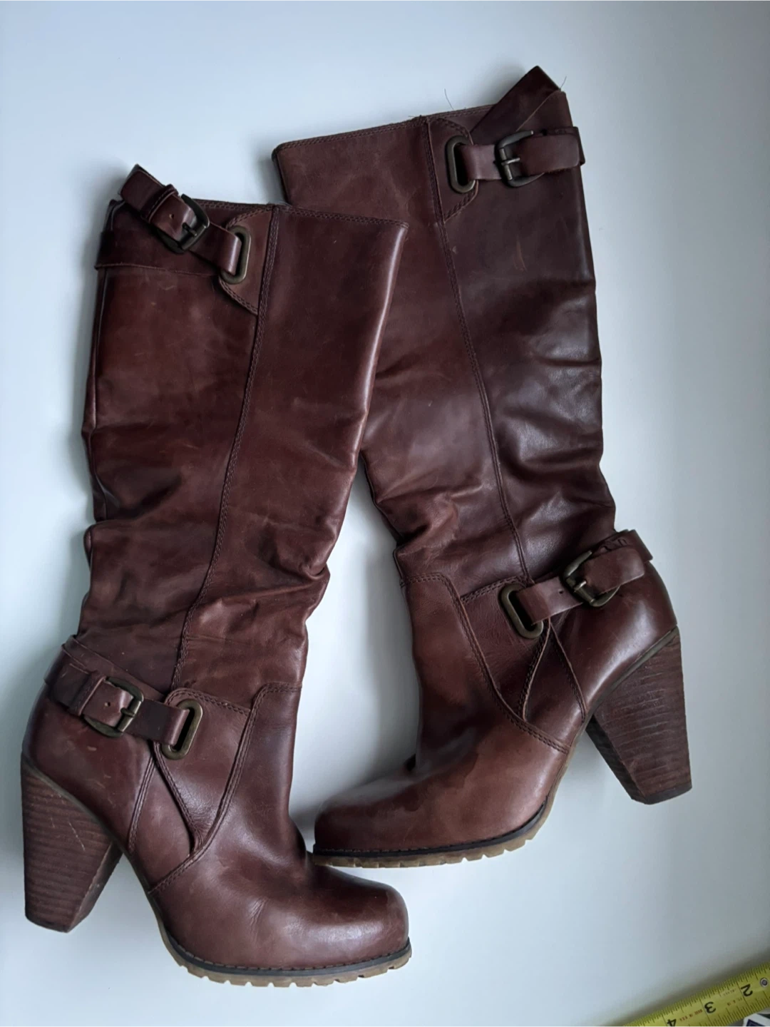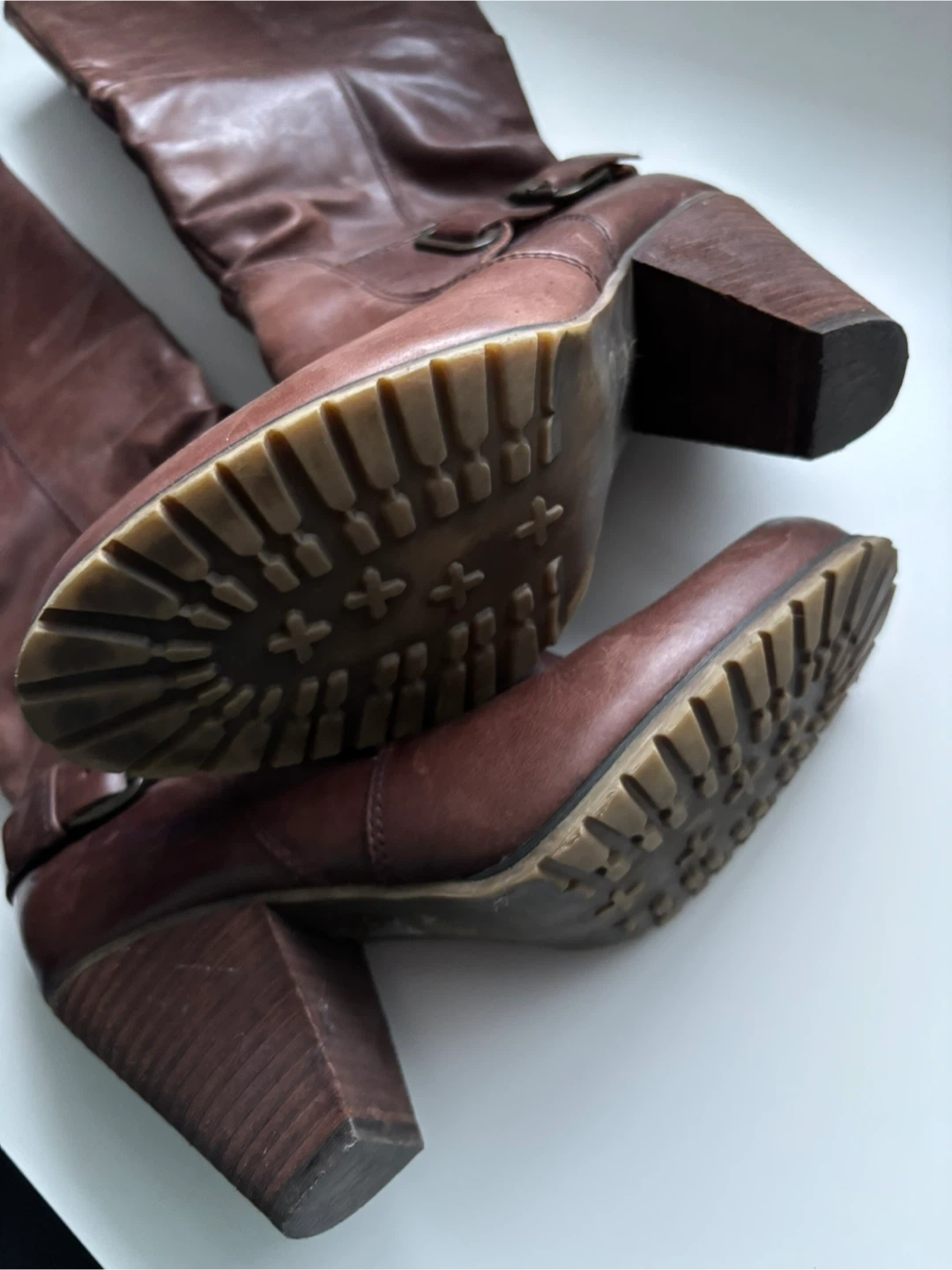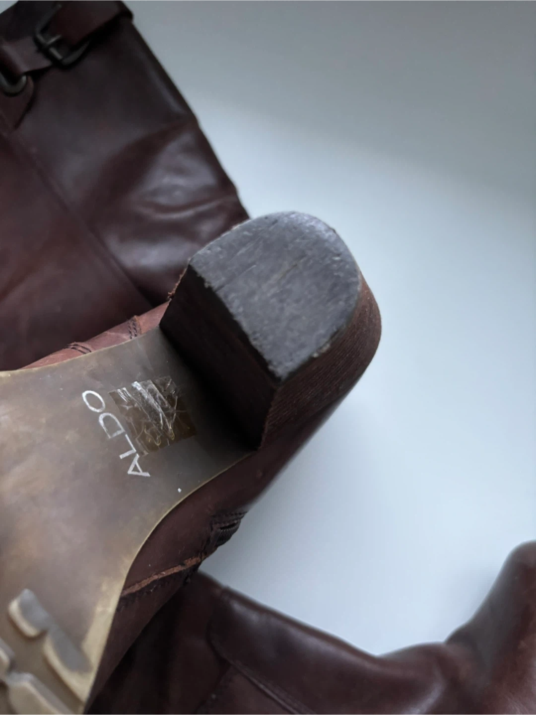 Selling a pair of Aldo brown leather heeled boots. They are a European size 39, which is equivalent to a US size 39. These boots have a stylish, rugged look with buckle details and a comfortable heel height. They are in good condition and ready for a new owner!