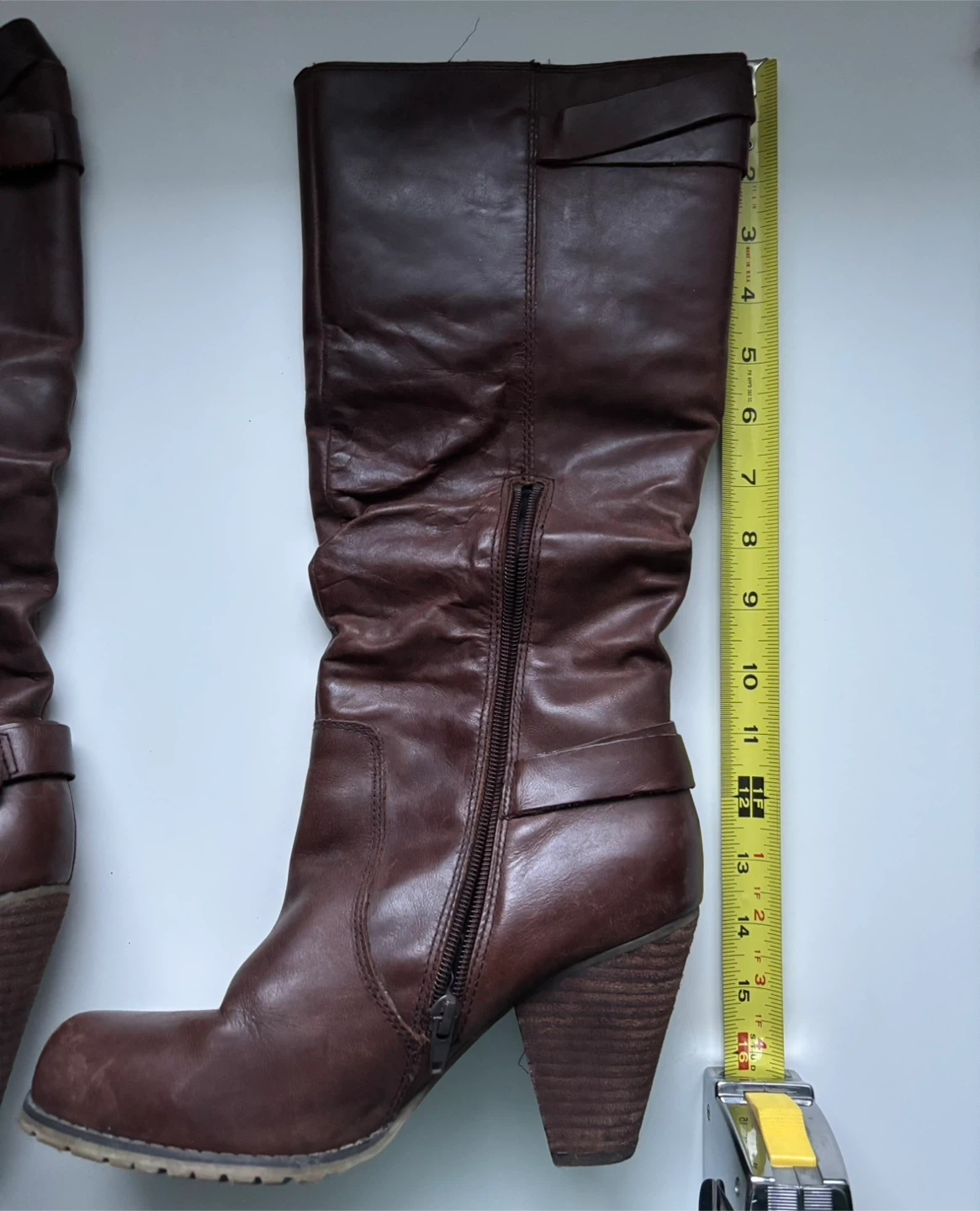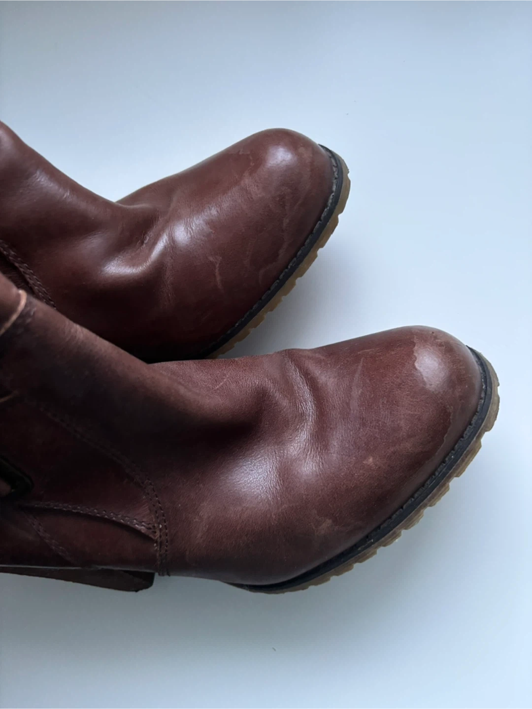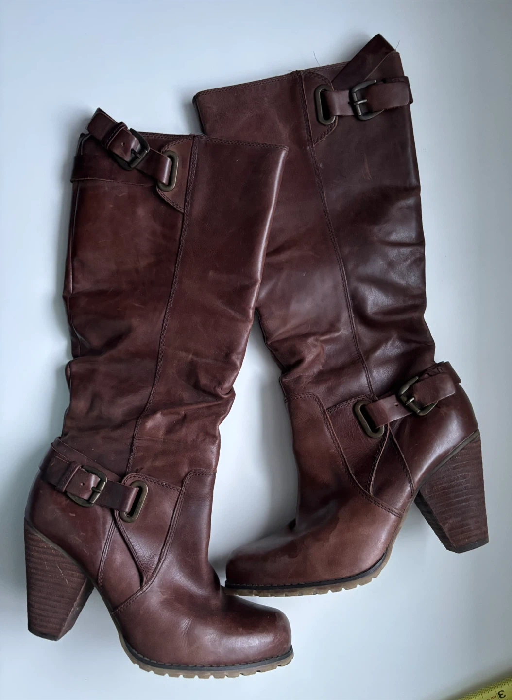 Selling a pair of Aldo brown leather heeled boots. They are a European size 39, which is equivalent to a US size 39. These boots have a stylish, rugged look with buckle details and a comfortable heel height. They are in good condition and ready for a new owner!