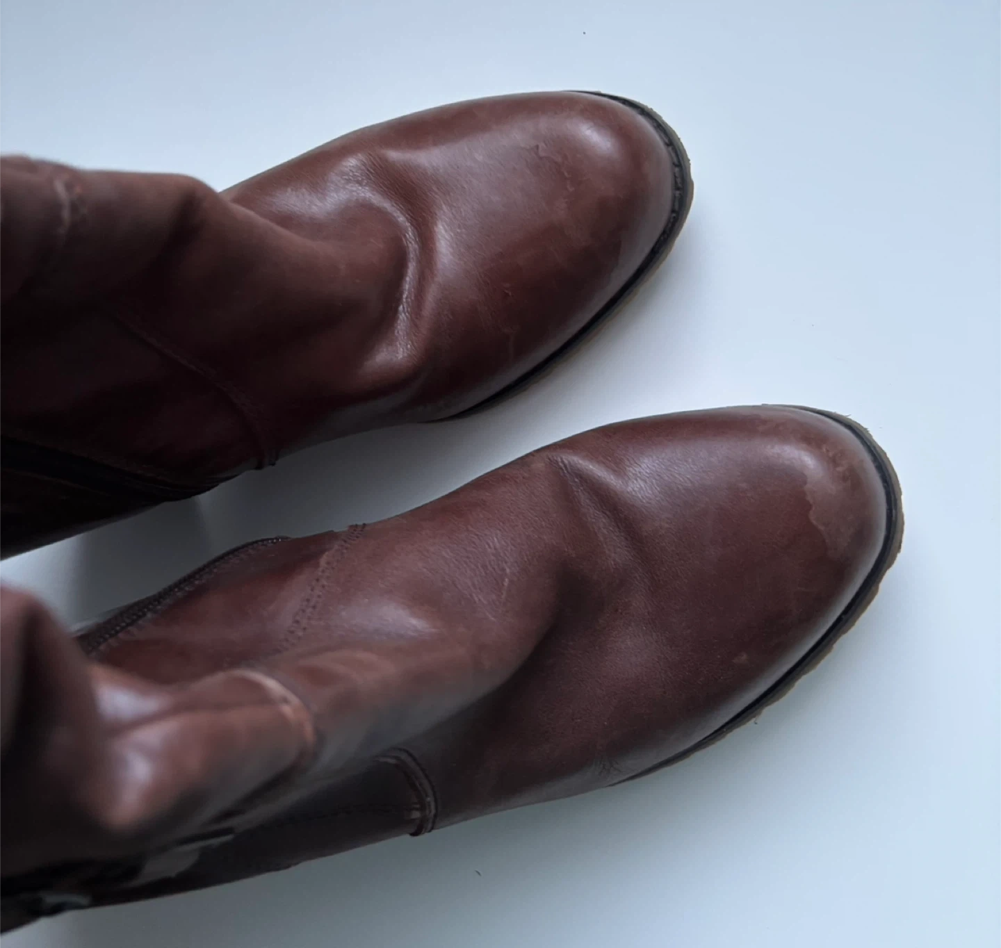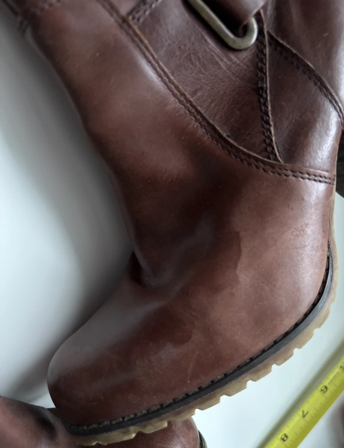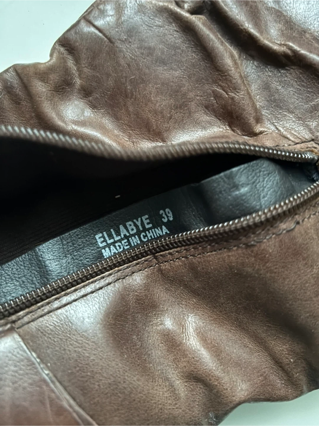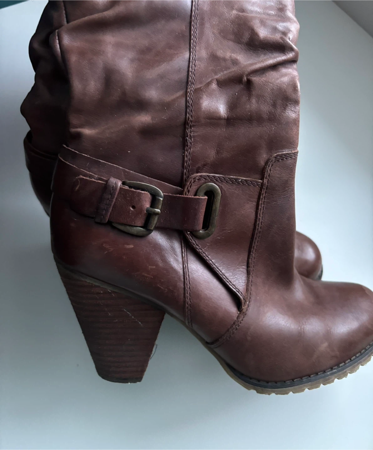 Selling a pair of Aldo brown leather heeled boots. They are a European size 39, which is equivalent to a US size 39. These boots have a stylish, rugged look with buckle details and a comfortable heel height. They are in good condition and ready for a new owner!