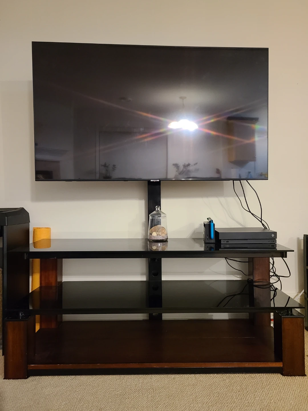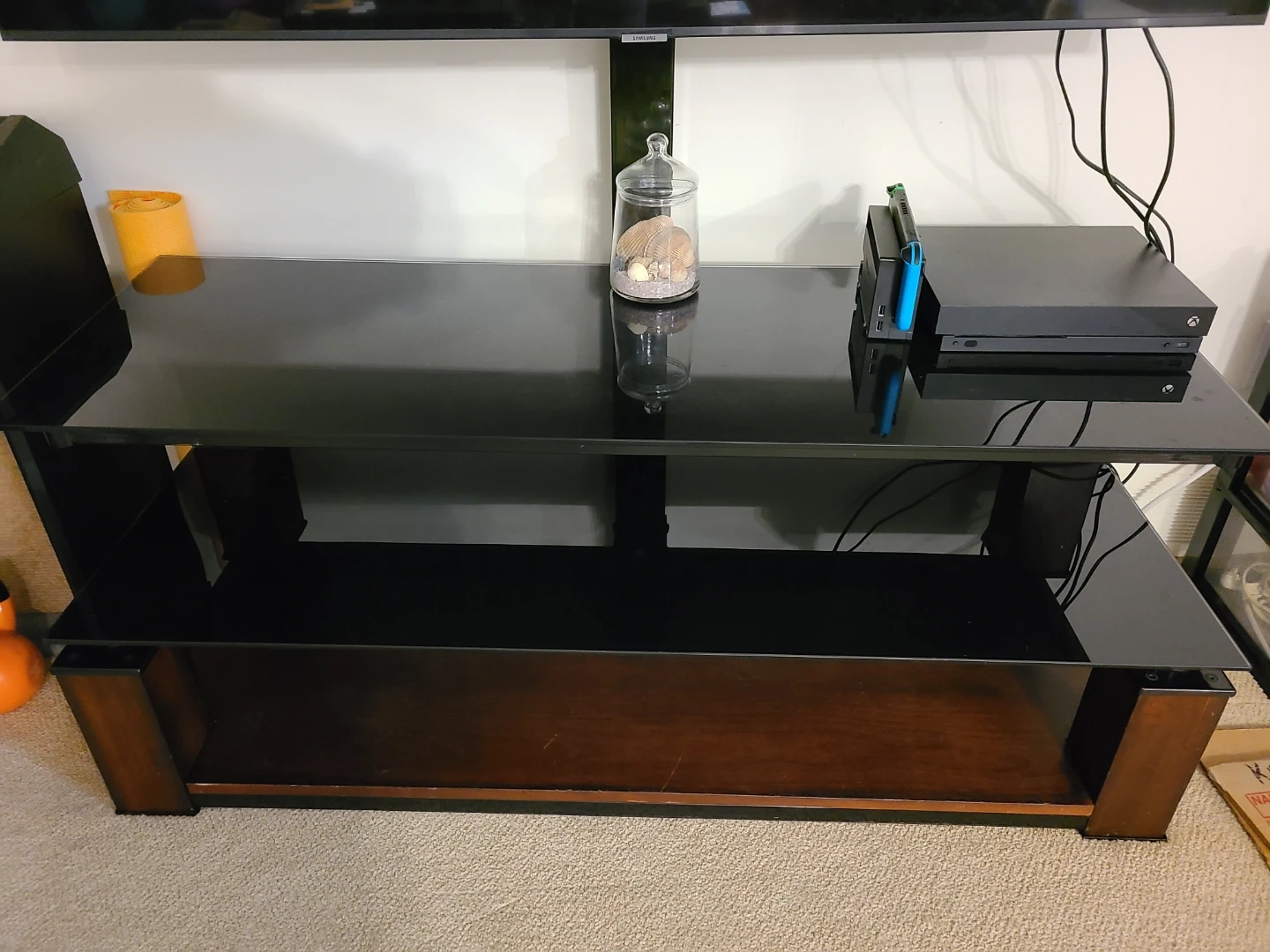 Selling a black glass TV stand with wood accents. The tv mount swivels for different tv angles, and is adjustable for a higher or lower sitting screen. The mount is hollow for you to feed the chords through, so you dont have to look at them. It's in great condition and perfect for any living room setup! It has three shelves for ample storage. I have it disassembled for easy pickup.