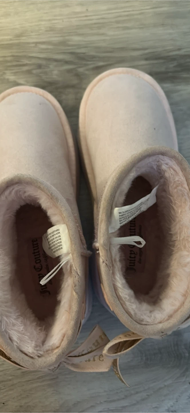 Selling a pair of super cute Juicy Couture boots! They are a lovely light pink colour and in great condition. The size is 3, perfect for keeping your feet cozy and stylish. These boots feature a sweet ribbon detail on the back