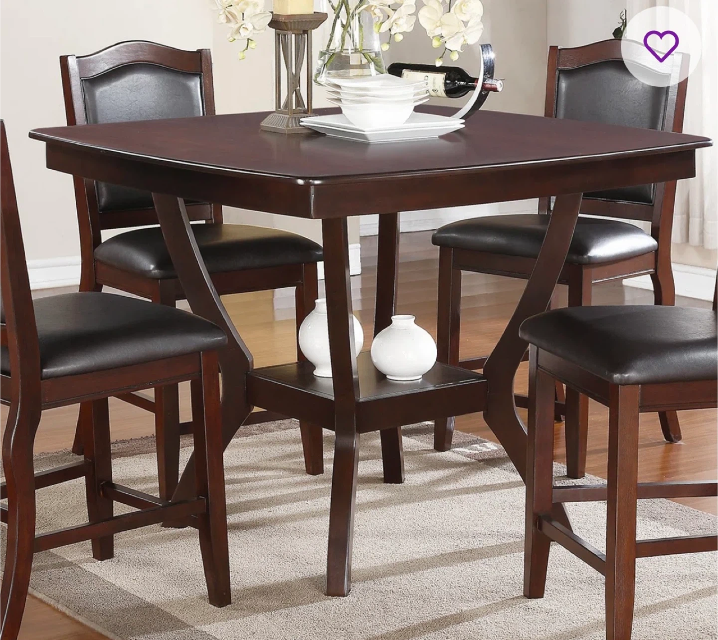 Selling a pub table set that includes a square table and six chairs.It features a unique leg design and a small shelf under the table top. Great for a smaller dining space or kitchen!