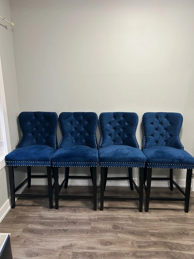 These stools feature a plush, tufted velvet upholstery with silver nailhead trim and a sturdy dark wood frame. They were hardly used over the last 2 years and have been well cared for. Bought from TSC for $275 per chair.
