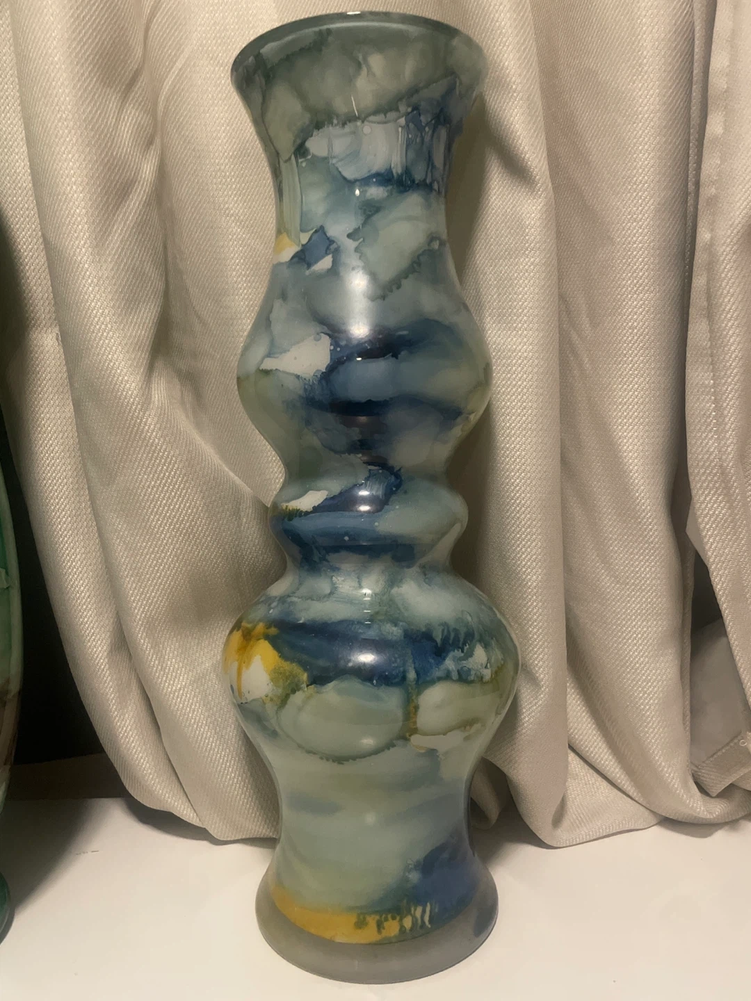 Beautiful decorative vase with a unique blue, white, and yellow pattern. It's in great condition and would look lovely in any room!