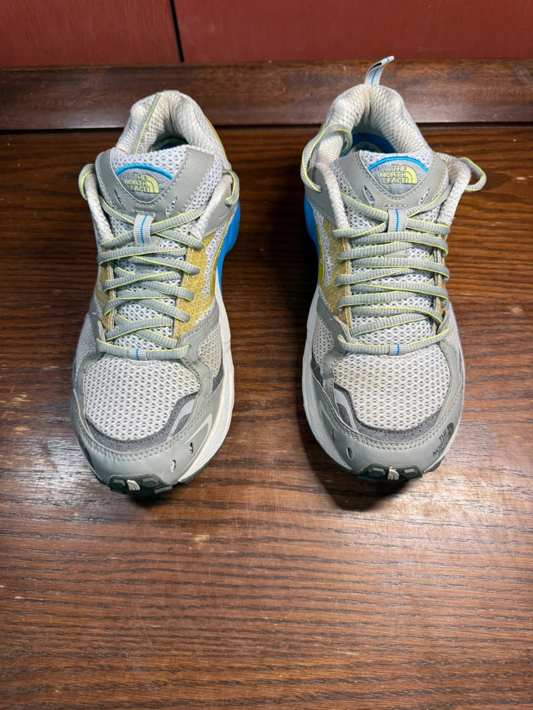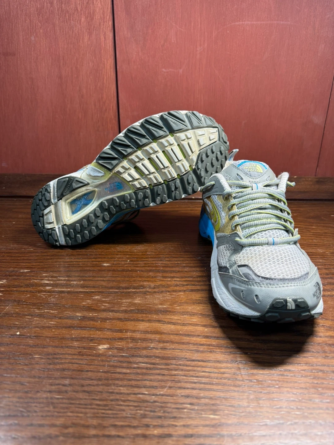 Get ready to hit the trails with these used The North Face Double-Track running shoes, designed for women and perfect for any outdoor adventure. These shoes come in size 8.5 US, providing a comfortable fit for your runs.