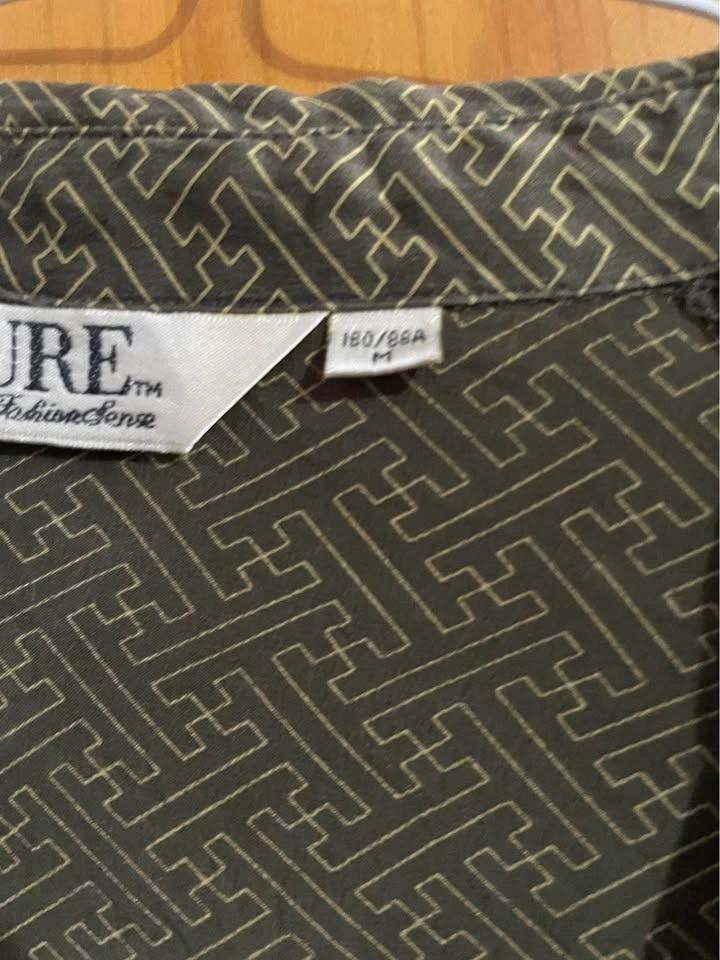 Stylish olive green long-sleeve shirt with a subtle geometric maze print. Lightweight and soft, perfect for layering or casual wear.