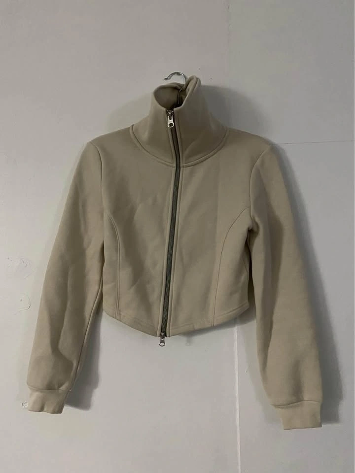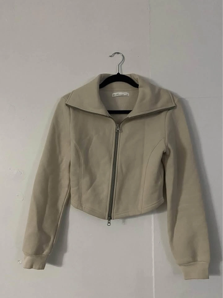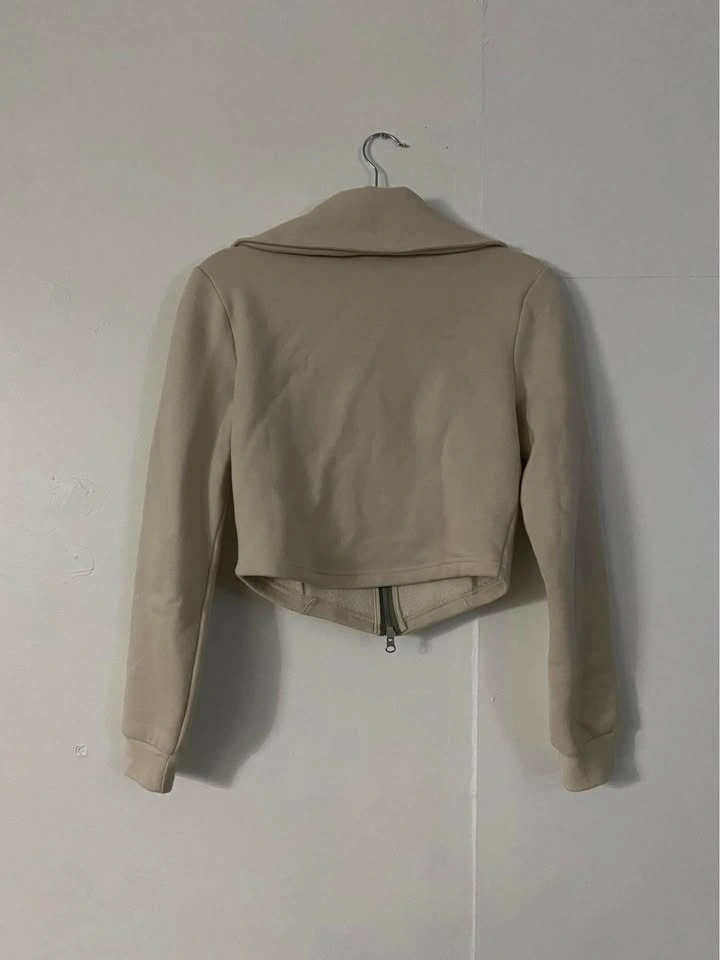 Used twice but prefer jackets that aren’t cropped for myself. The front is slightly longer and the zipper goes all the way to the tip so you can make it like a turtle neck jacket, or u can keep it down like in the first picture. Has been sitting my closet for too long now.