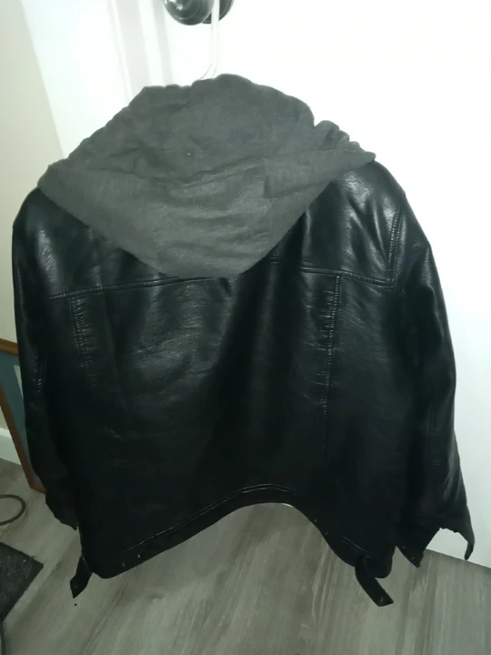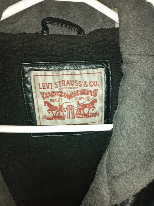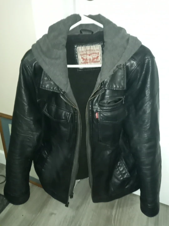 Levi Strauss & Co. jacket in great condition! It's a black leather jacket with a grey hood and a cozy sherpa lining. Perfect for staying warm and stylish! Classic hooded sherpa truckers jacket also called really comforatable fit sof leather does not get stiff in this cold also the lining is warm in this chilly weather.. durable to say the least