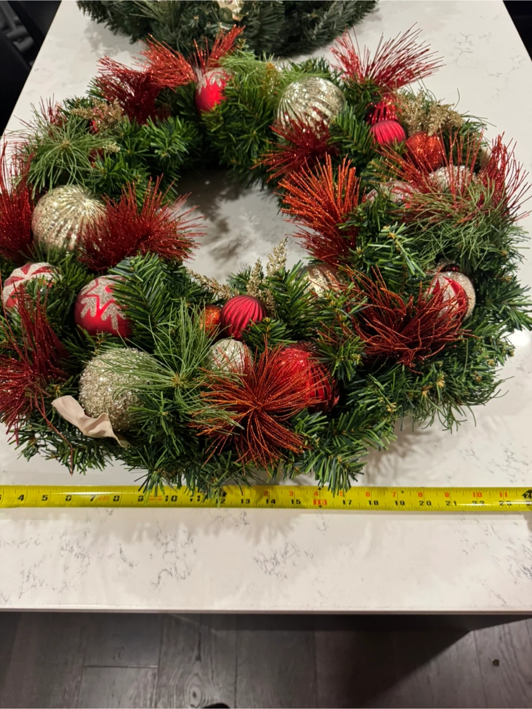 Festive Christmas wreath featuring red and gold ornaments! It's perfect for adding a touch of holiday cheer to your home. The wreath measures approximately 24 inches in diameter.