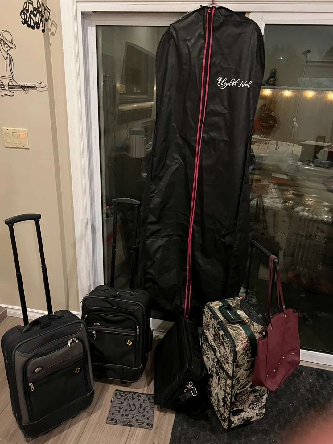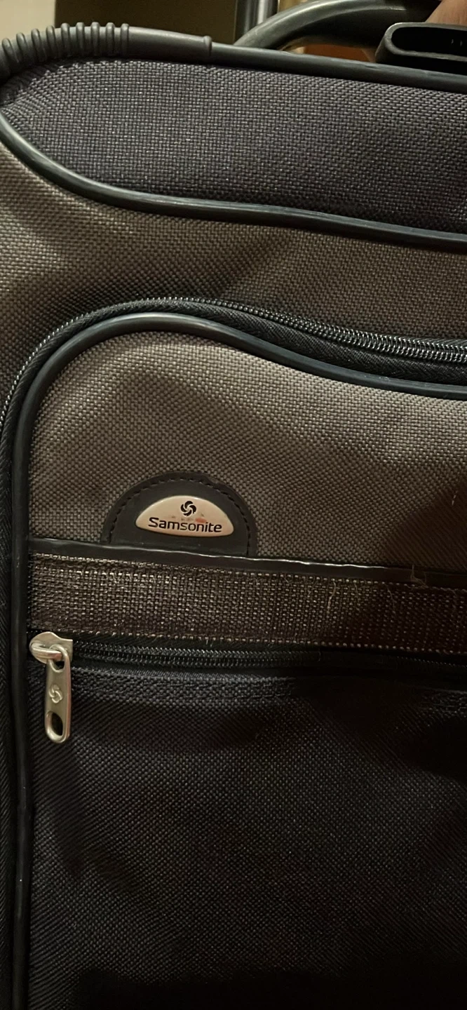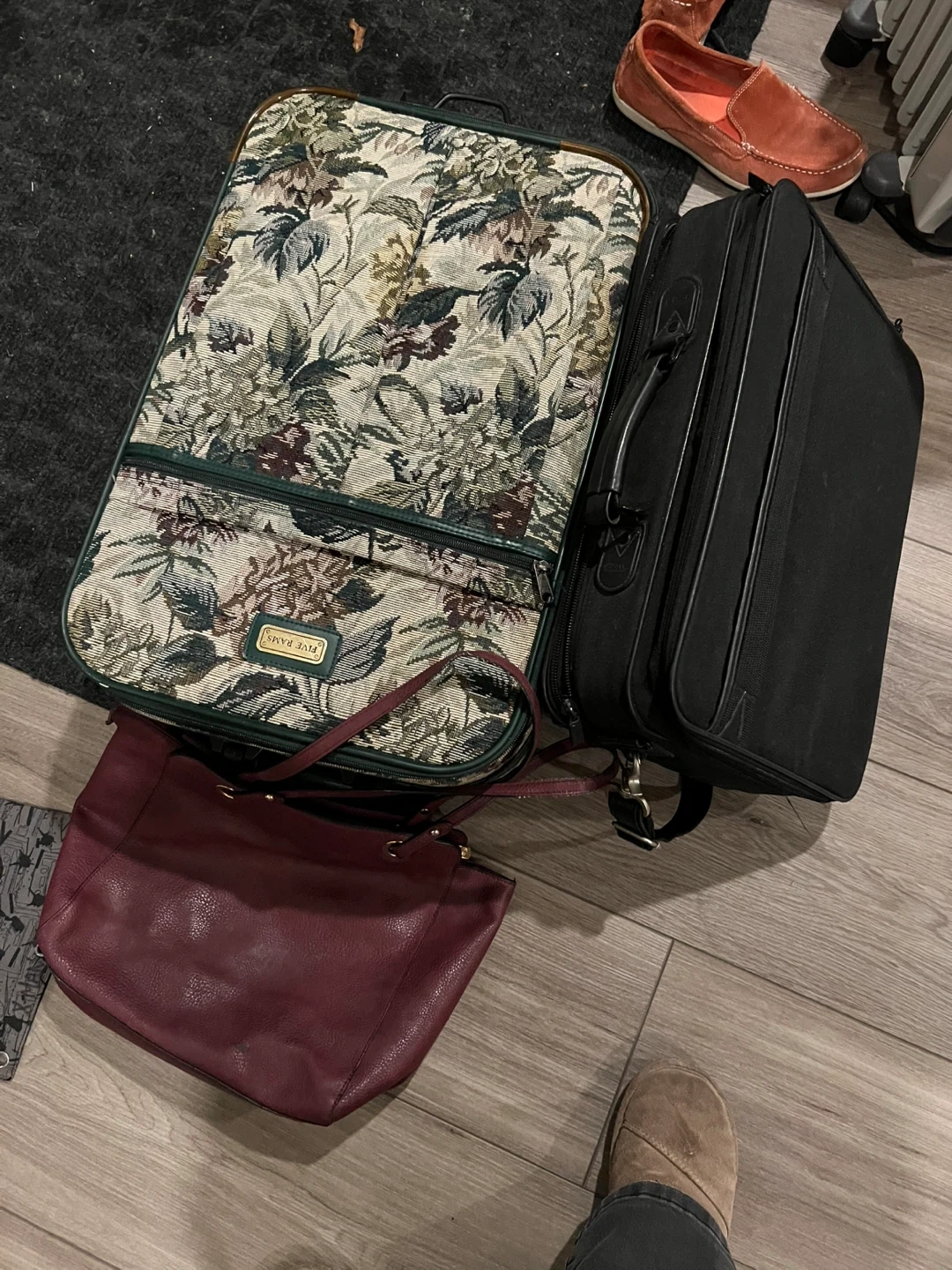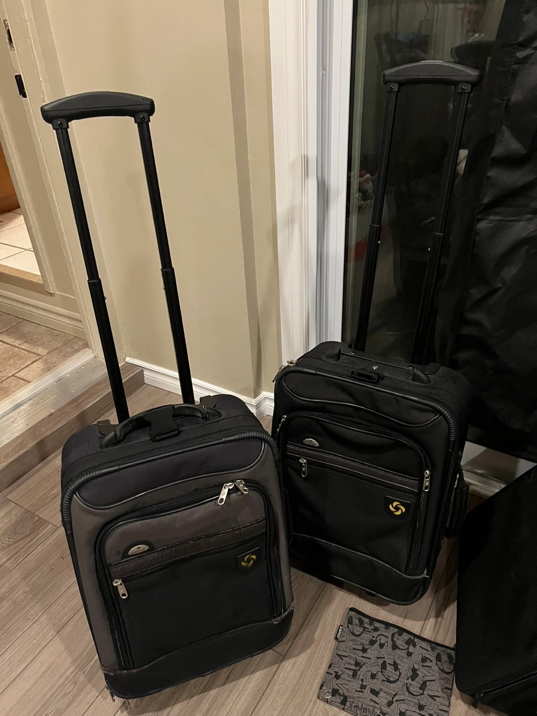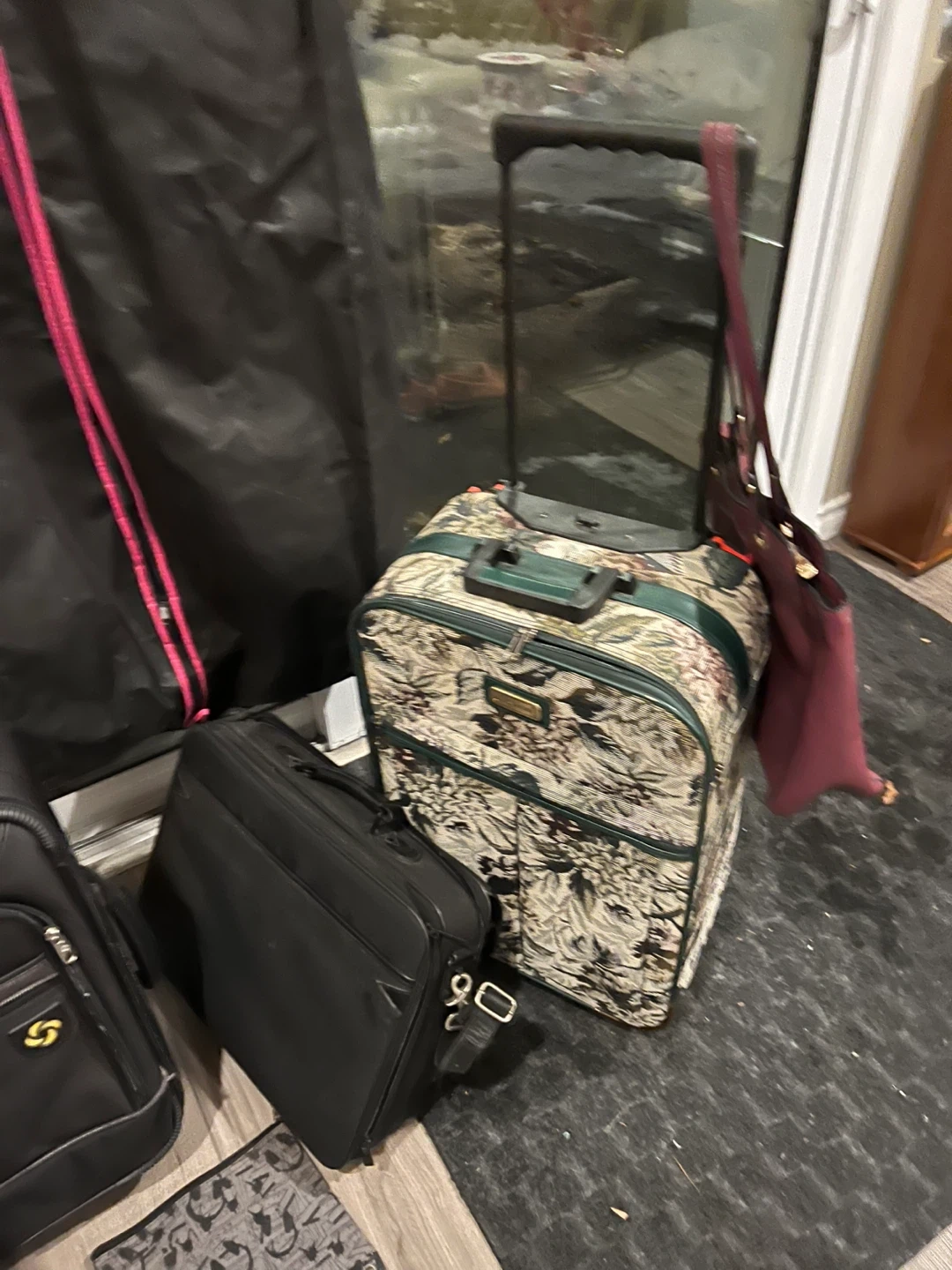 Selling a collection of luggage including two Samsonite suitcases and one floral patterned suitcase. Also included is a dress bag.