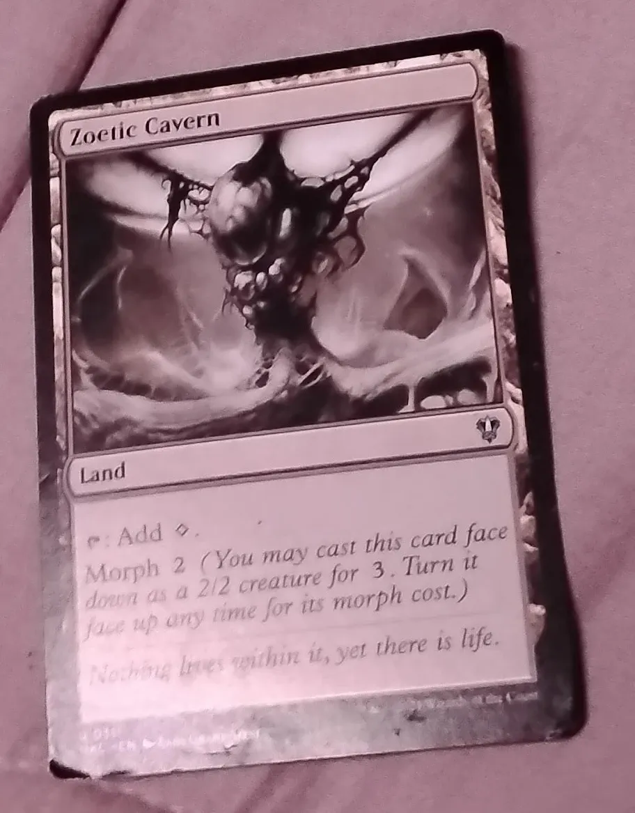 Selling a Zoetic Cavern Magic The Gathering card. It's a land card with the ability to add. It also has a morph ability allowing you to cast it face down as a 2/2 creature for 3 and turn it face up any time for its morph cost