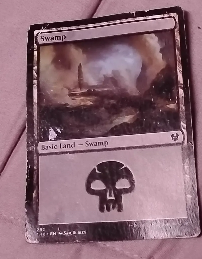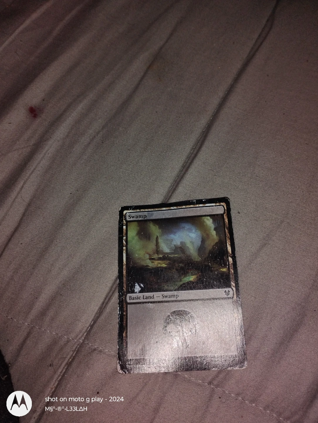 Selling a Magic: The Gathering card, a Swamp basic land. The card shows some wear and tear, as you can see in the pictures. Perfect for adding to your deck or collection!