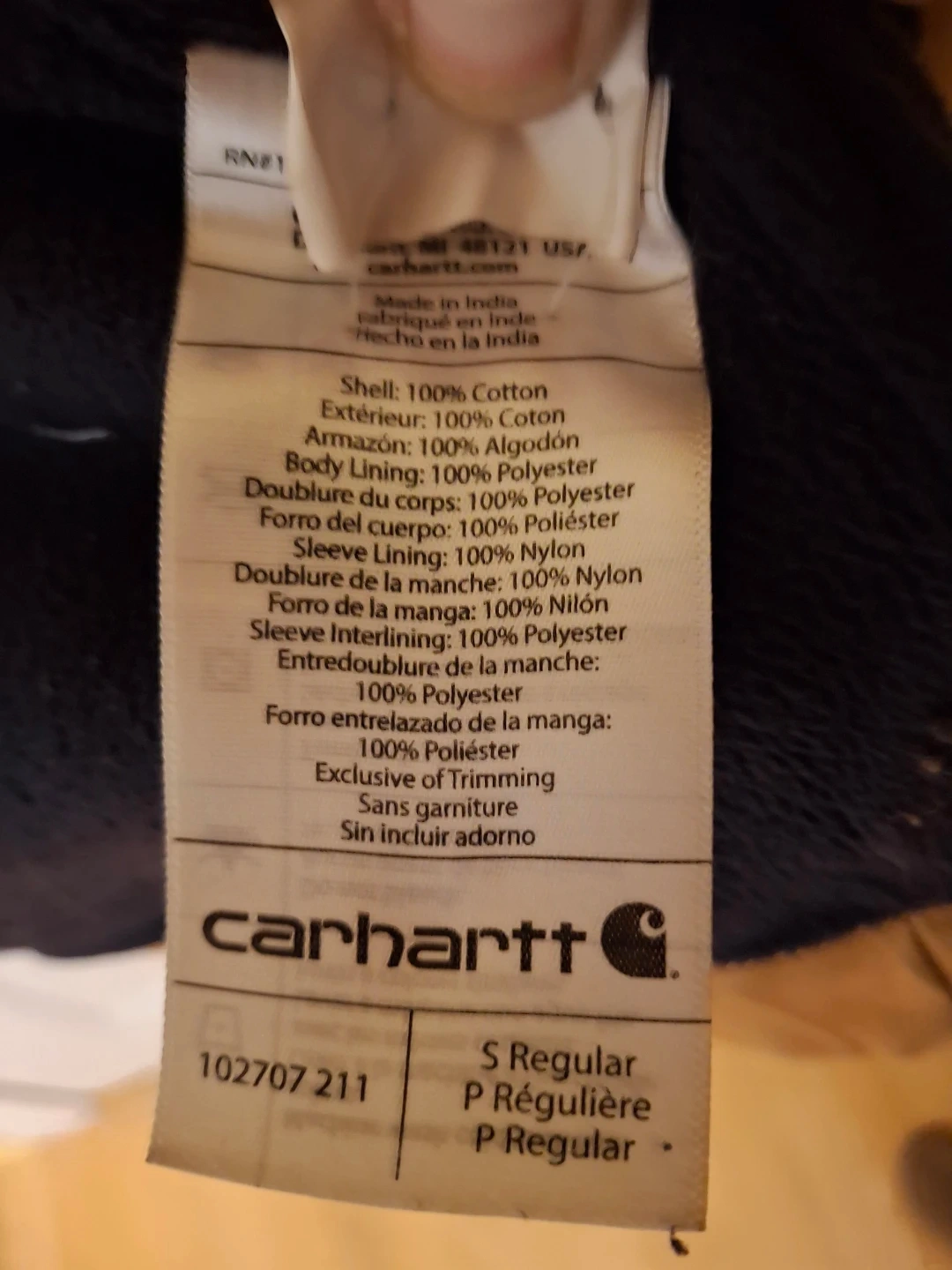 - Material: Shell is 100% Cotton, Body Lining is 100% Polyester, and Sleeve Lining is 100% Nylon