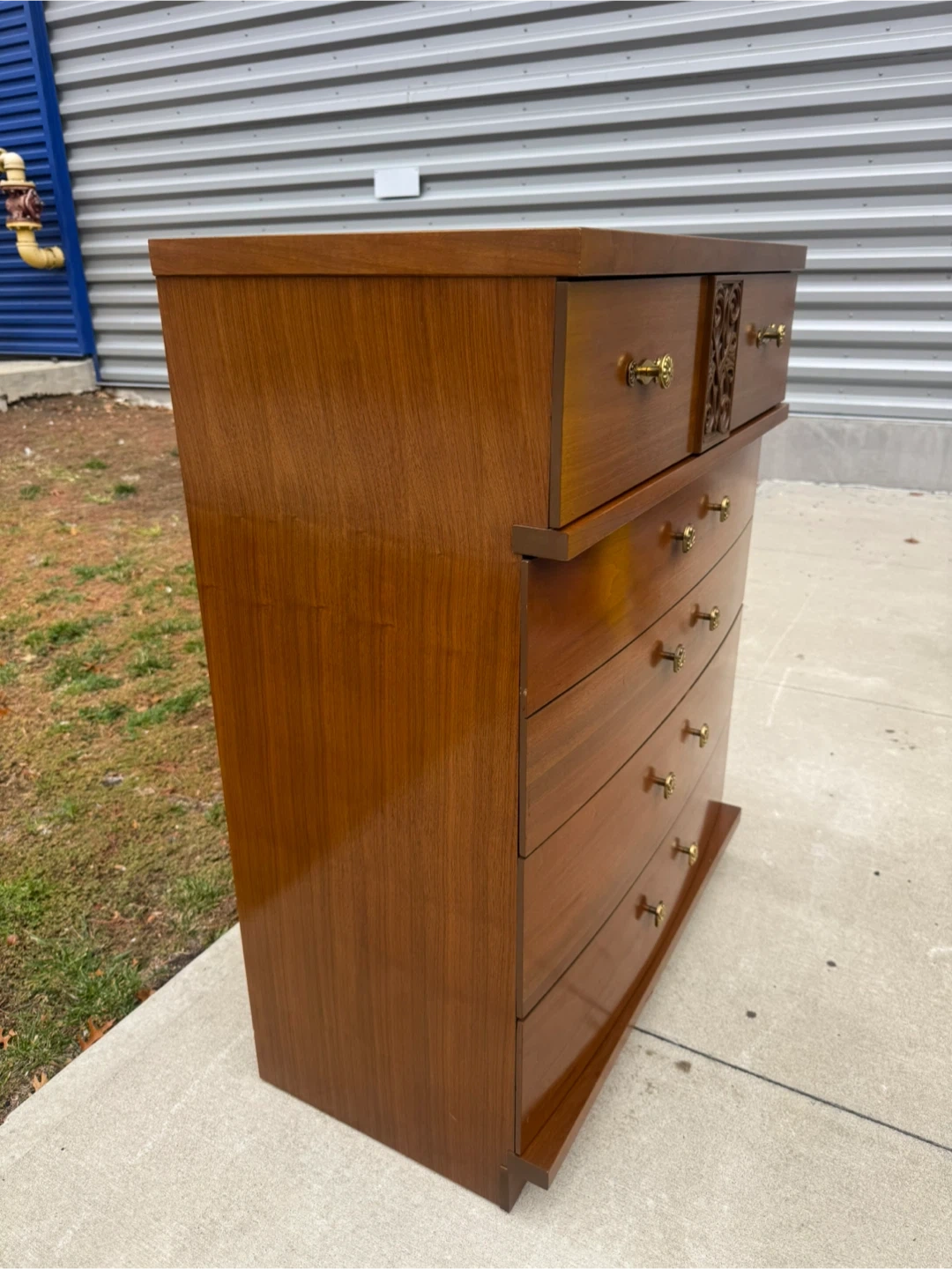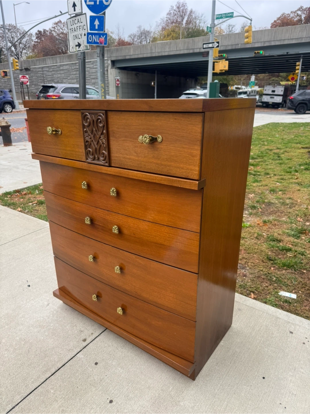 Selling a vintage wooden dresser with five drawers. It has a unique design on the top drawer and gold-colored knobs. It's in good condition and ready to add some character to your space!