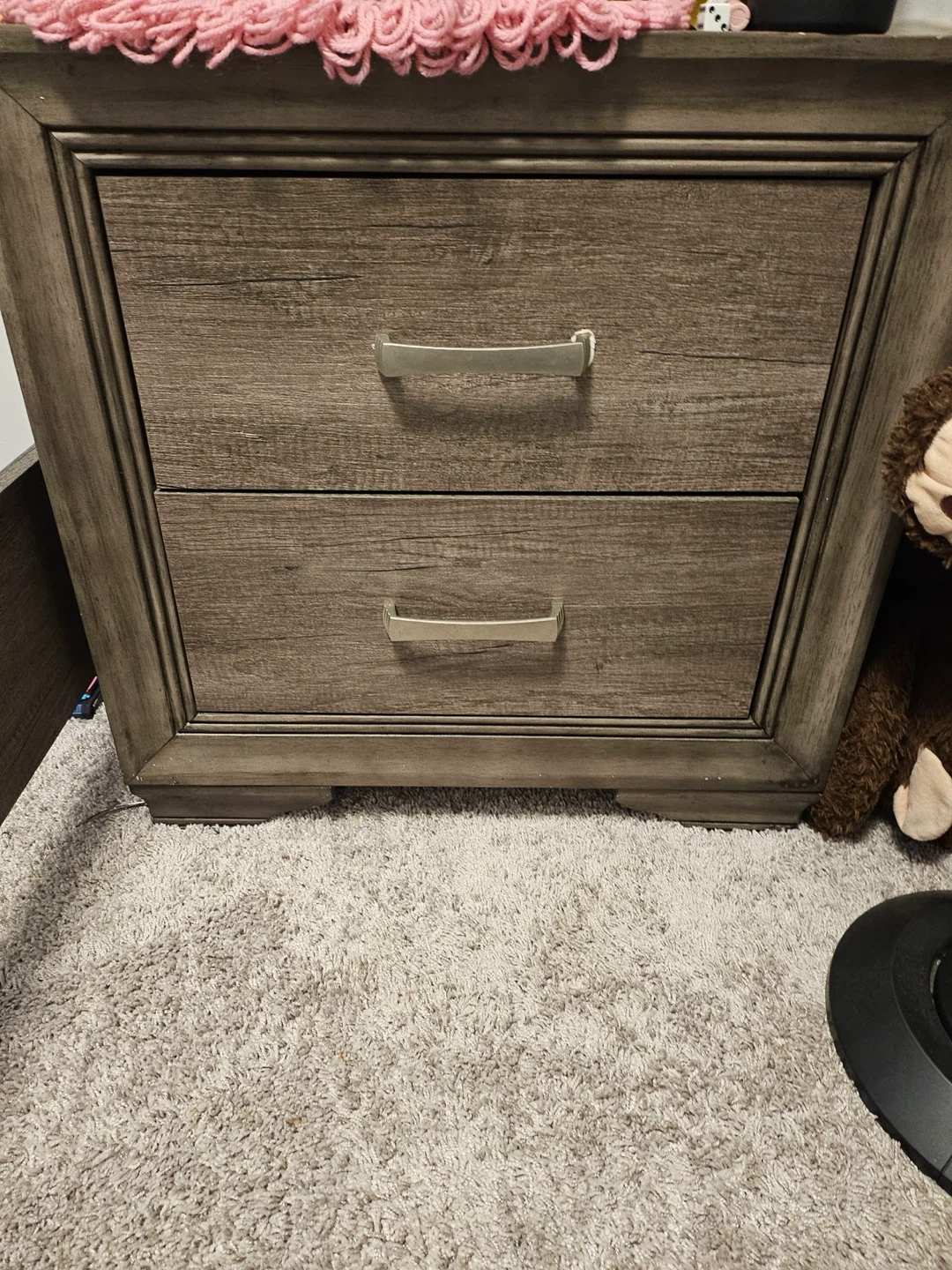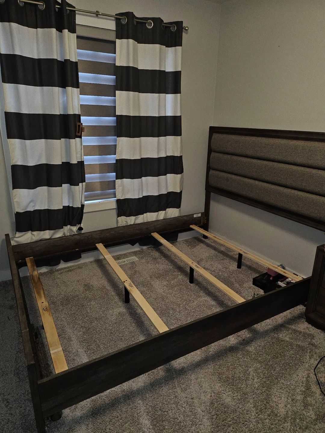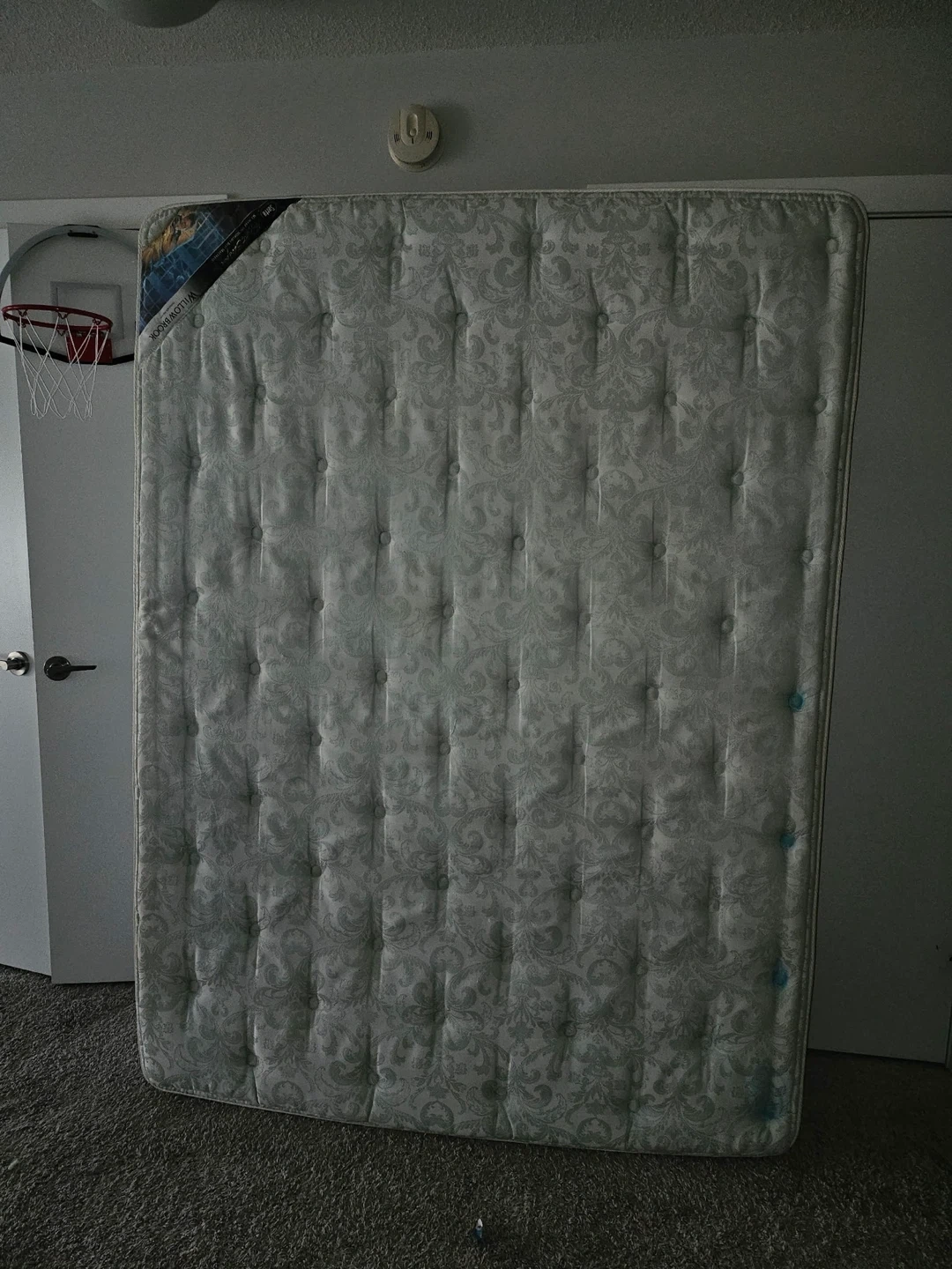 Selling a queen size bed frame with a headboard and a mattress. The bed frame is a dark wood colour with a padded headboard. The mattress is also included. Great for a bedroom set!