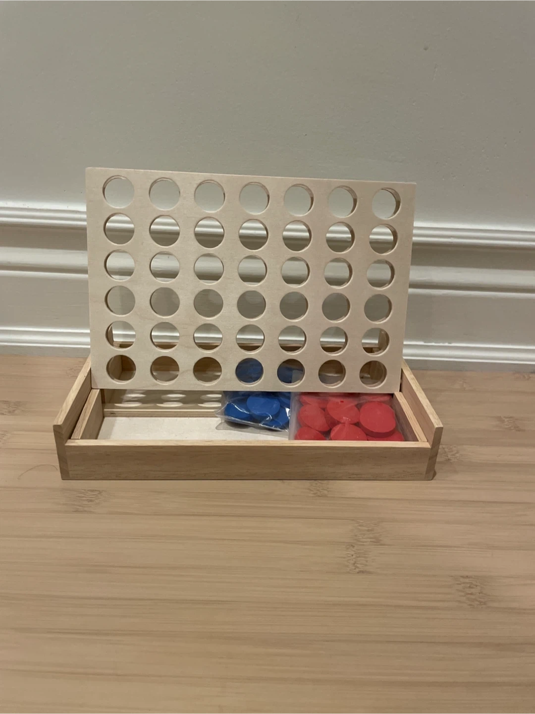 Selling a classic new wooden four-in-a-row game! It comes with all the pieces, neatly separated into red and blue, so you're ready to play right away. It's in great shape and perfect for family game nights or keeping the kids entertained. Folds flat for great storage!