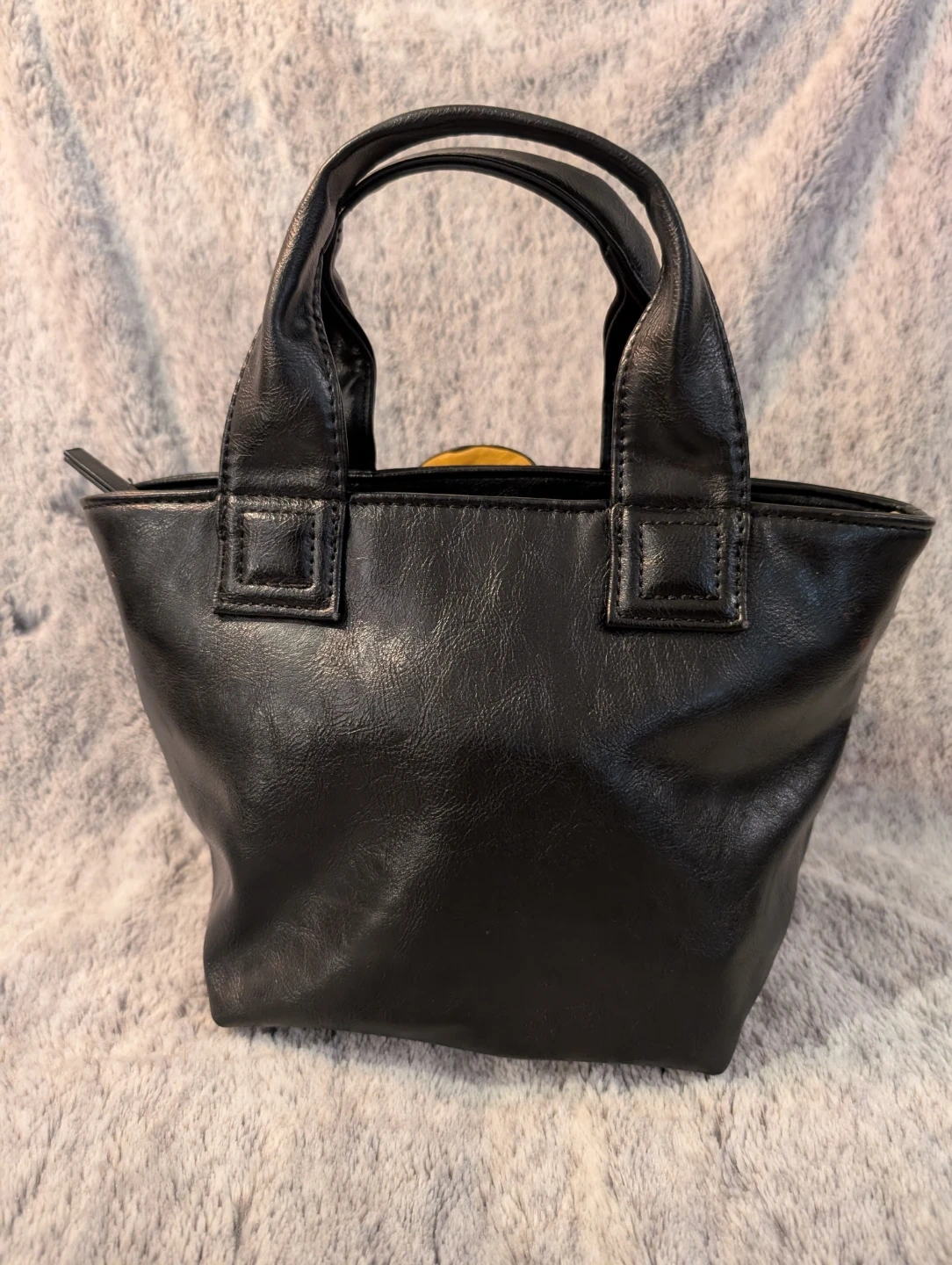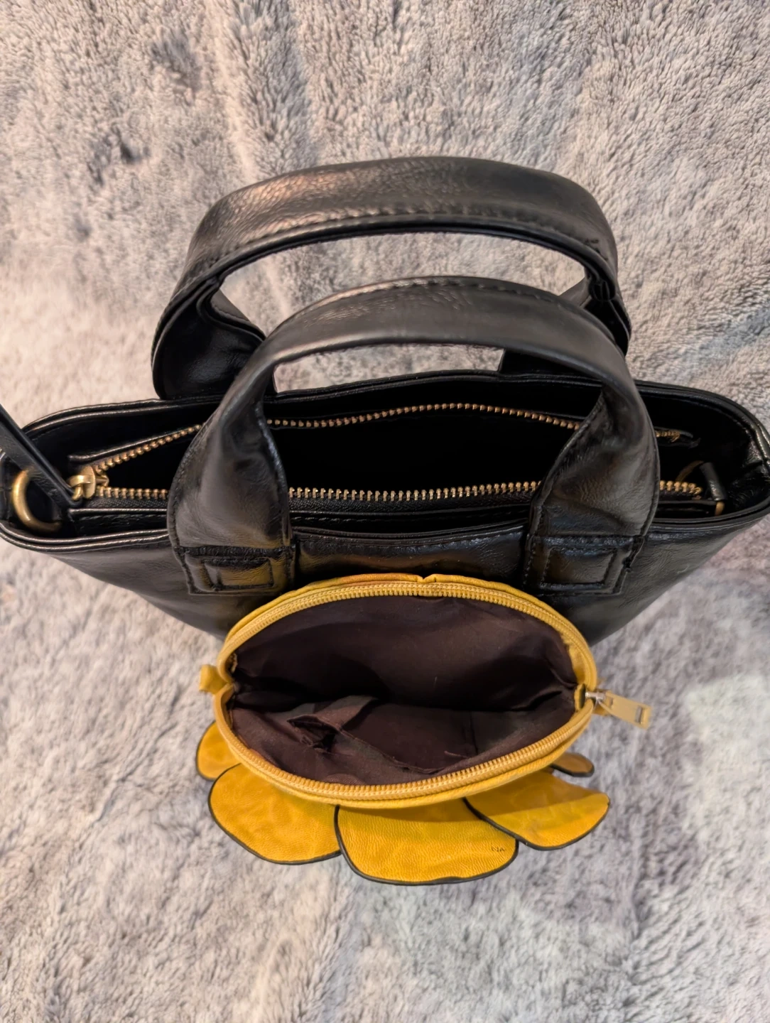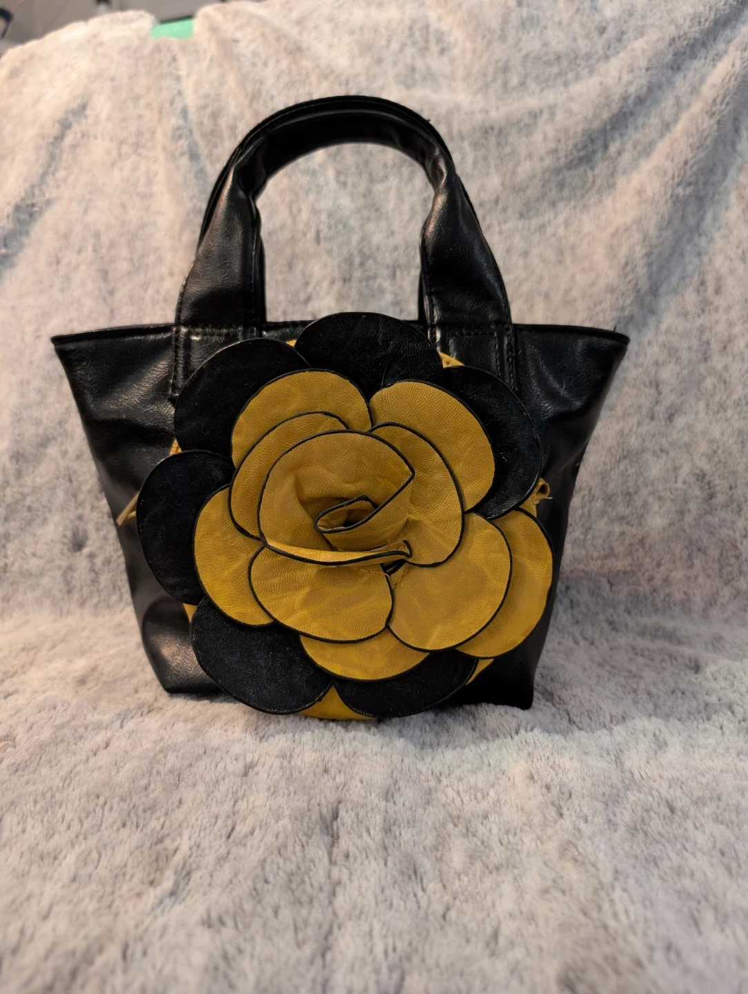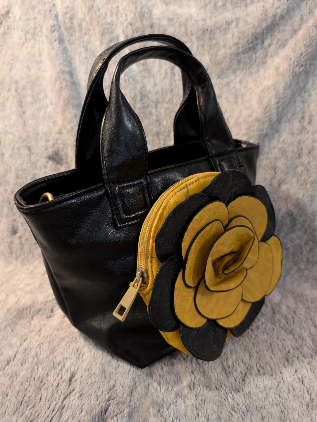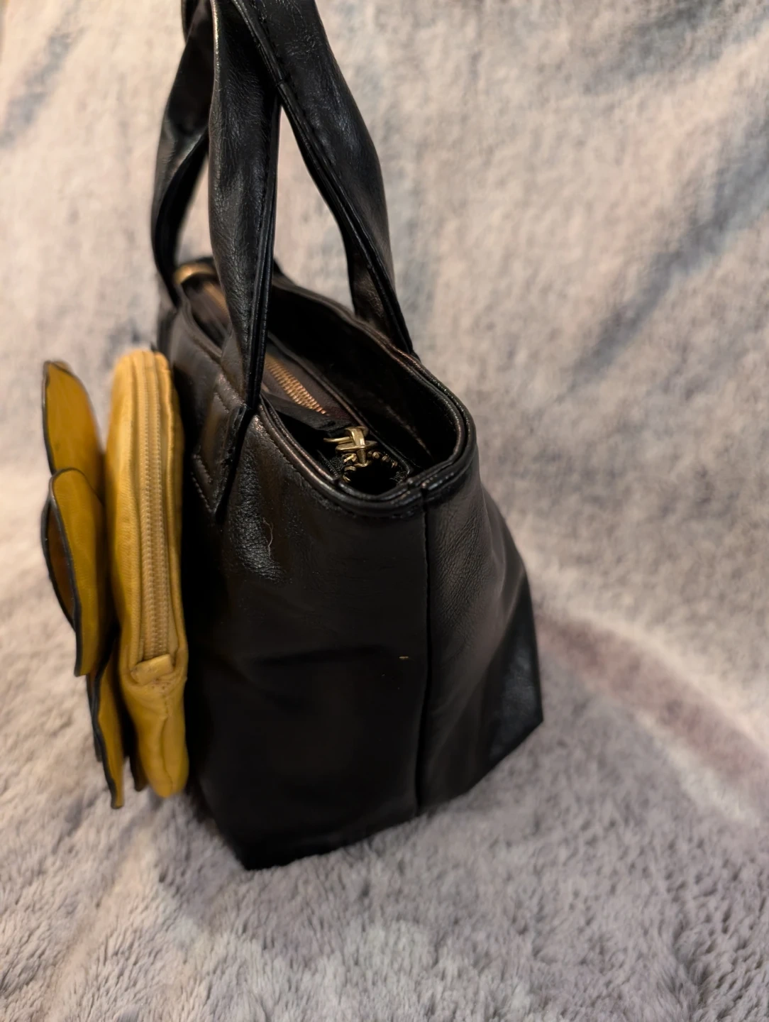 Selling a stylish black leather tote that features features a unique flower accent purse on the front that zips open and shut. Perfect for carrying your essentials. High quality leather, perfect condition, easy to carry around. Gives very chic vibes.
