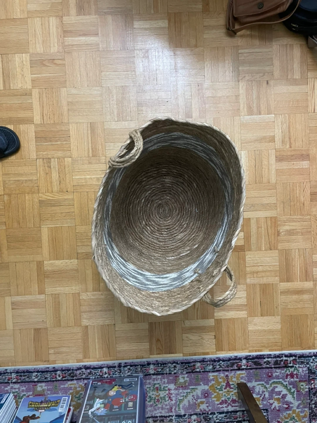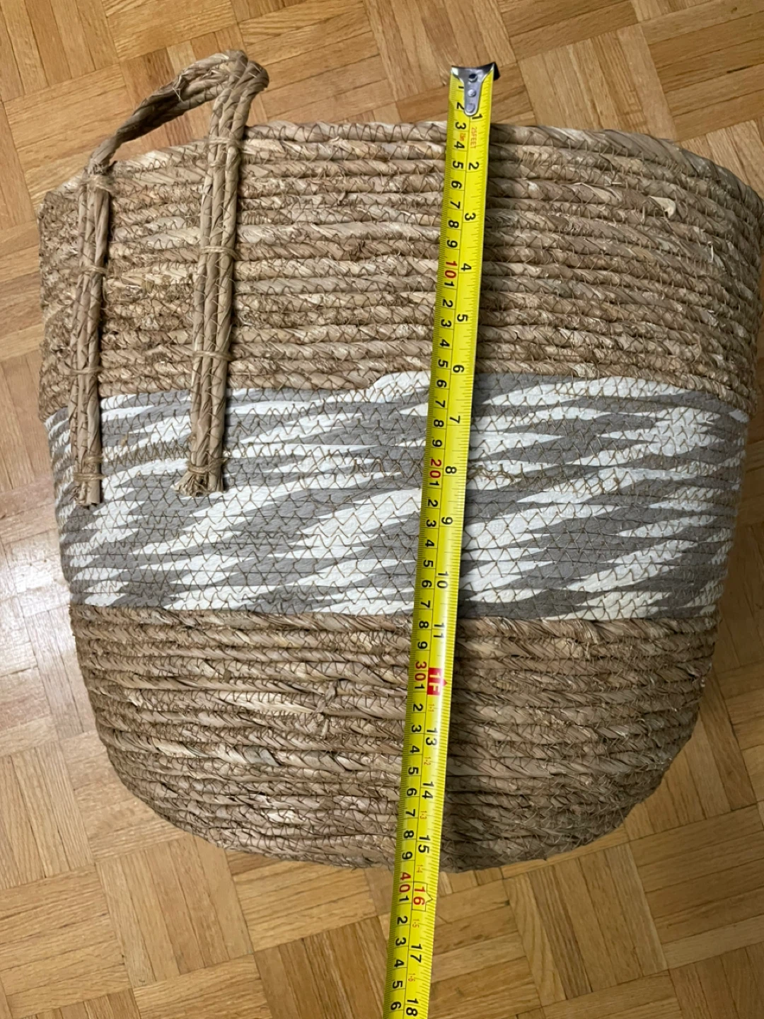 Selling a woven basket with handles, perfect for storage or decor! It's in great condition and features a lovely brown and white design. The basket measures approximately 17 inches in height.
