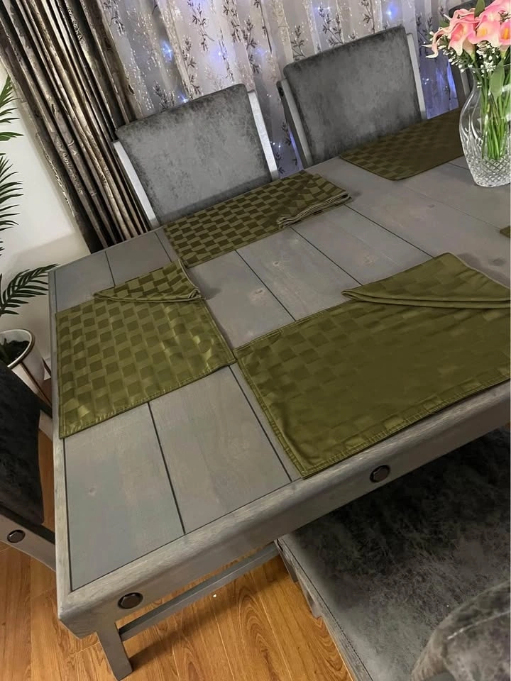 Set includes 6 placemats and 6 napkins. In good condition. Thick/heavy and durable material. Machine washable. Doesn’t need this anymore since it's for a 6 seater, otherwise it's perfect!