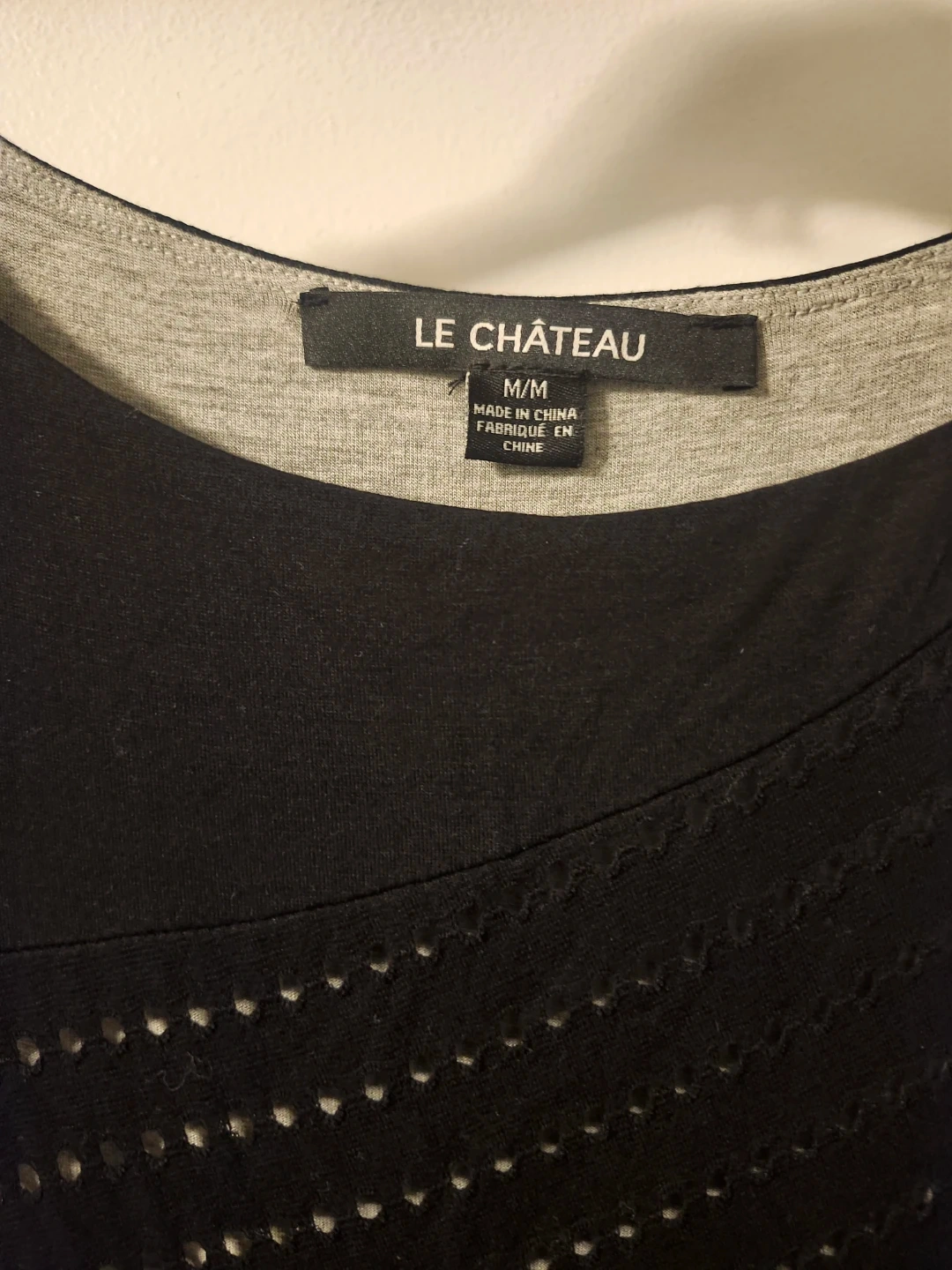 Selling a Le Chateau black dress in size medium. It has a unique design with sheer detailing throughout. Perfect for a night out or a special occasion!