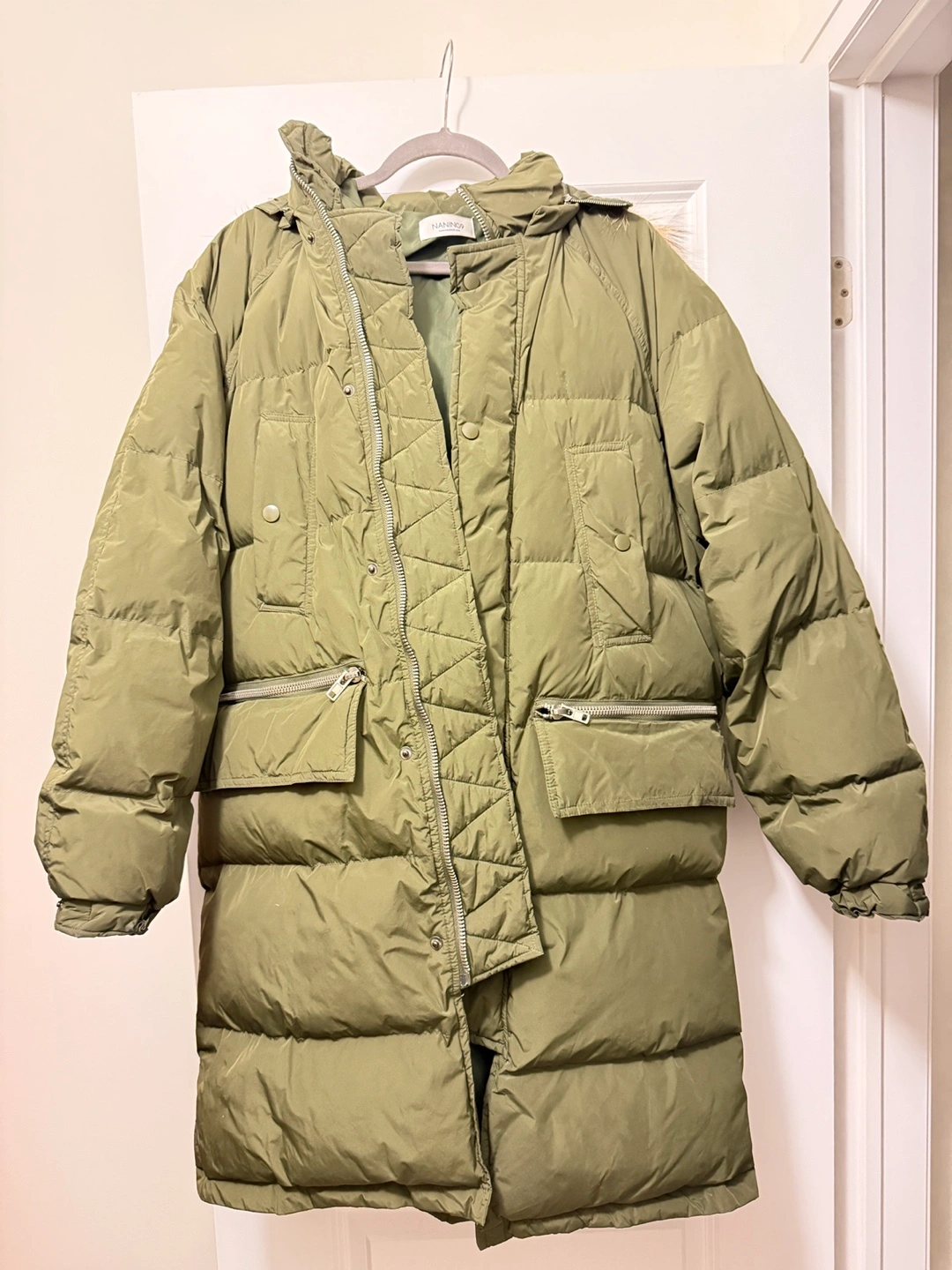 Selling a NANING9 padded down coat in olive green! It's a stylish and warm choice for the colder months. The coat features real fur hood and a comfortable, quilted design.