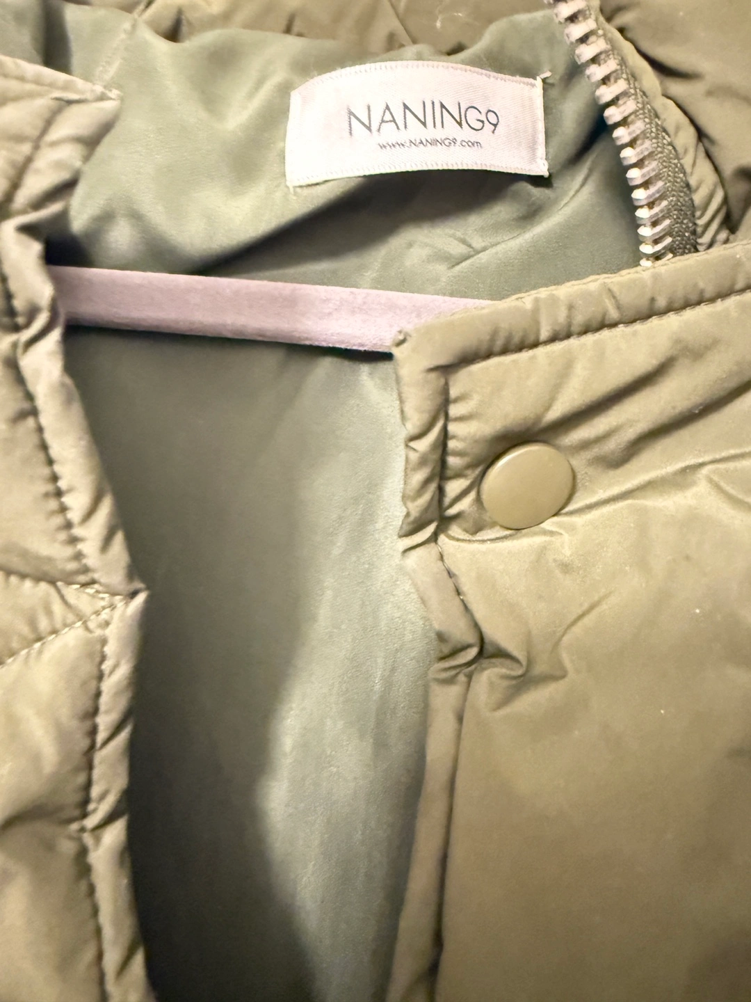 Selling a NANING9 padded down coat in olive green! It's a stylish and warm choice for the colder months. The coat features real fur hood and a comfortable, quilted design.