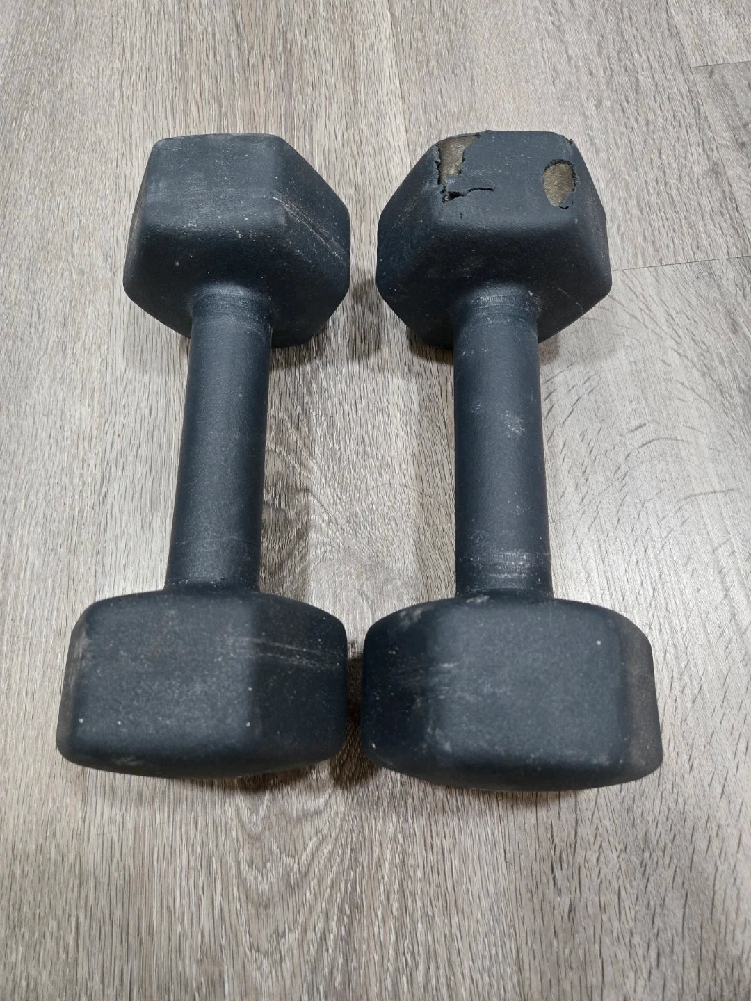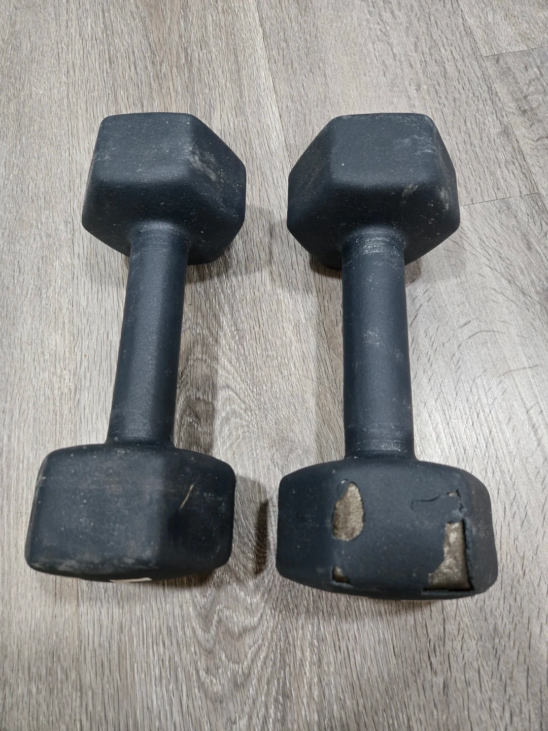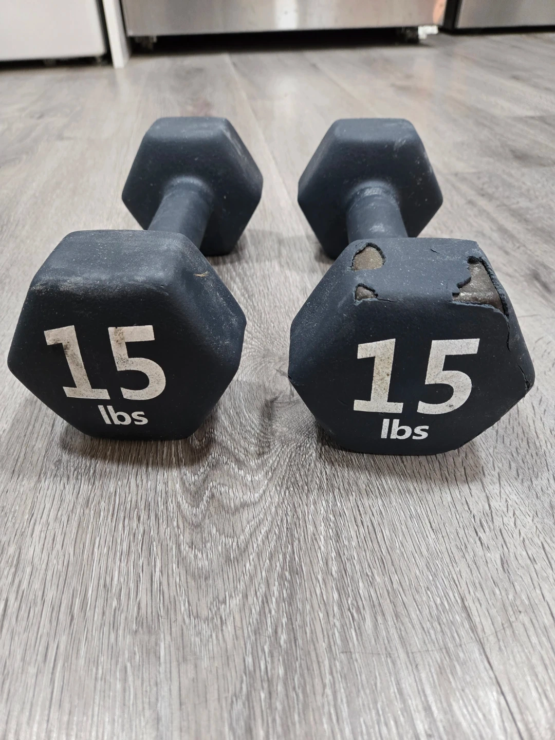 Free pair of Jogi 15 lbs dumbbells. They have some wear and tear, as you can see in the photos, but they're still perfectly functional for your workouts!