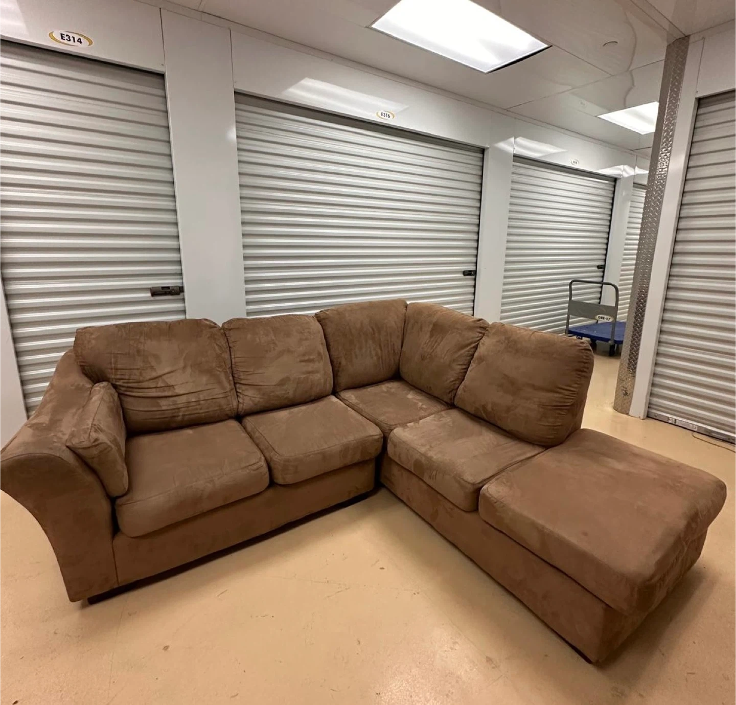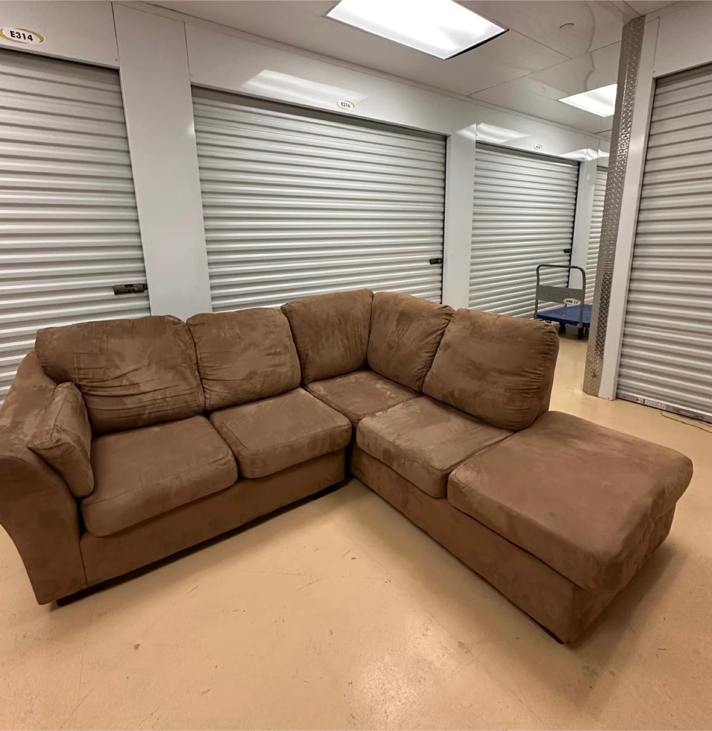 Selling a comfy brown sectional sofa with an ottoman. It's in good condition and ready for a new home! Perfect for a living room or den. Home delivery available