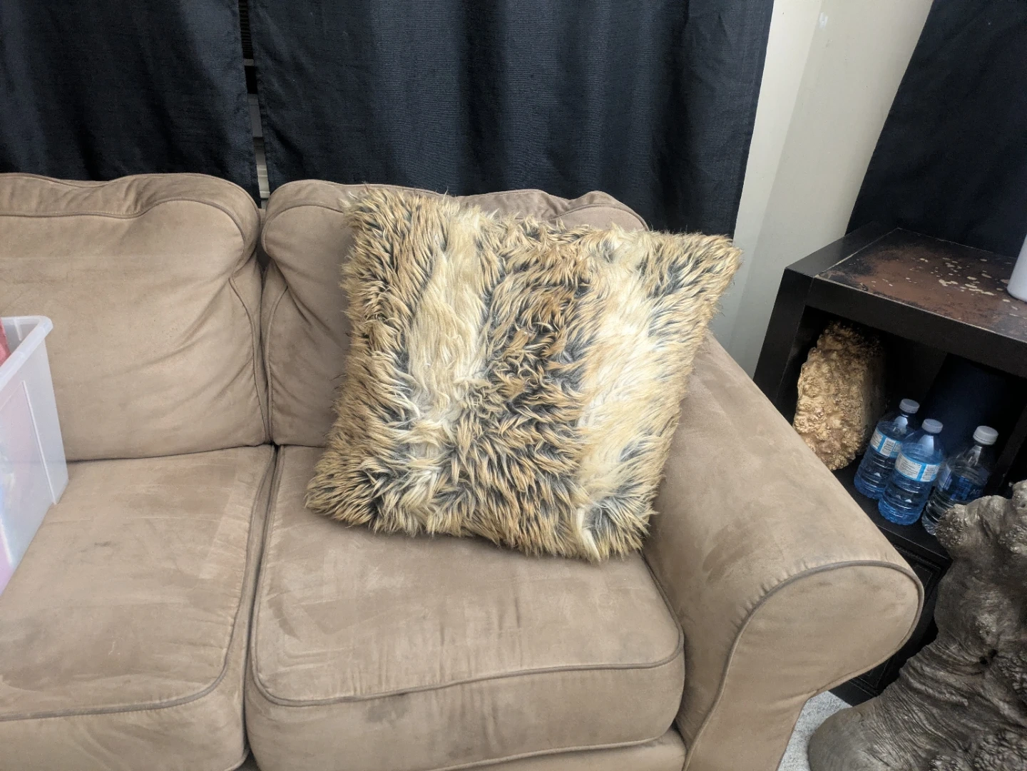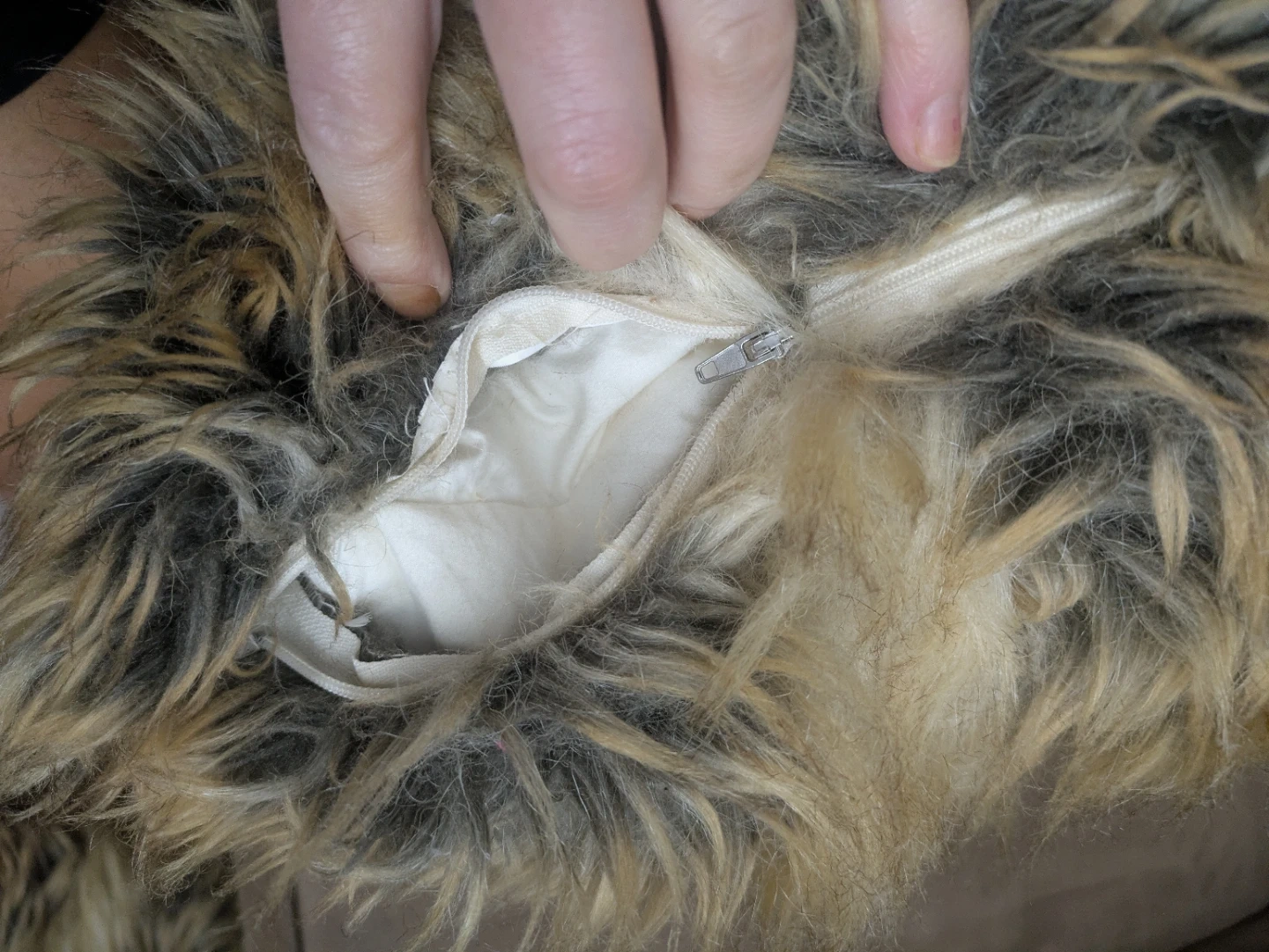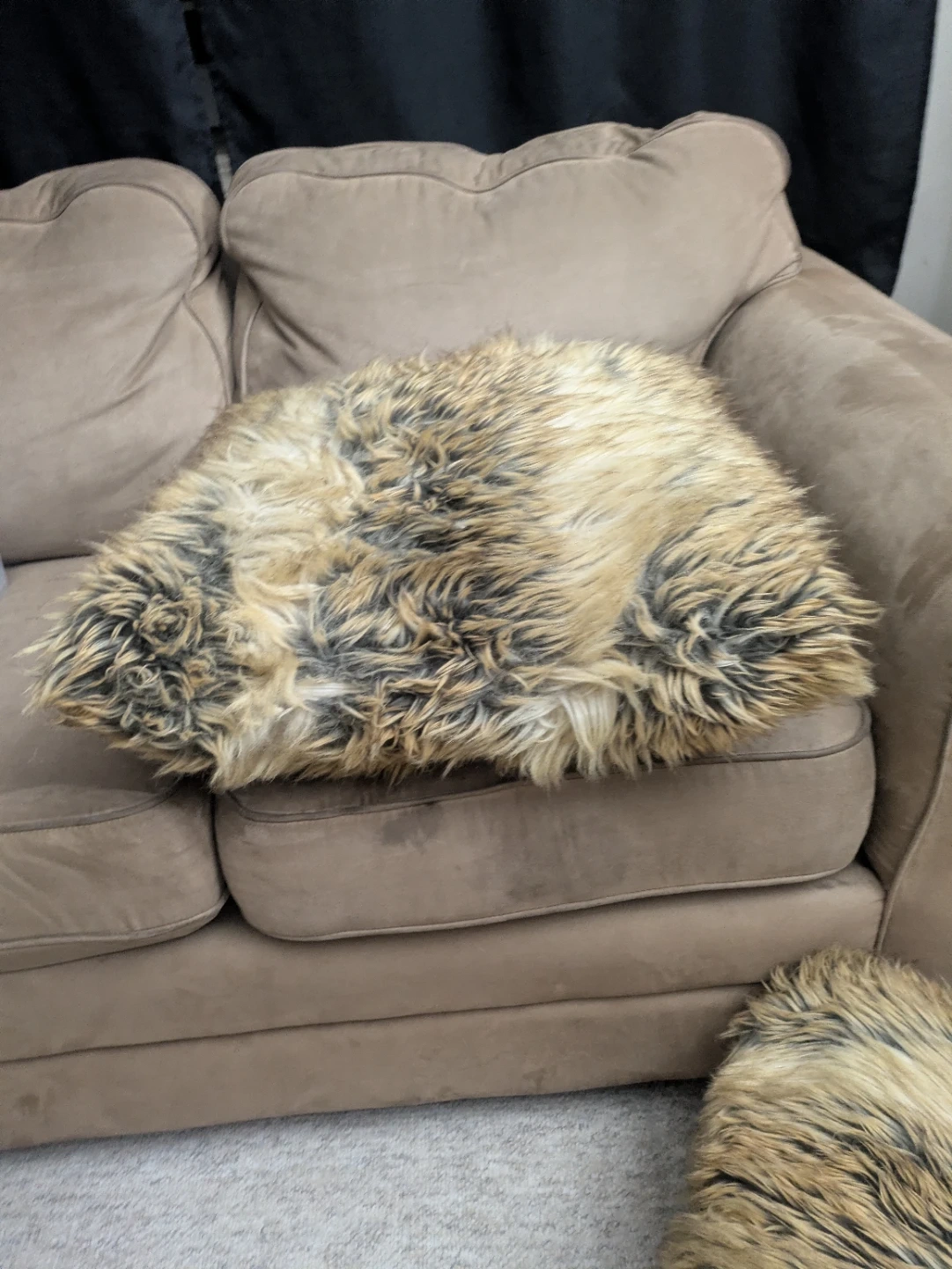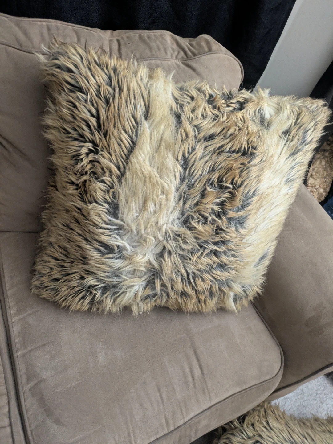 Selling a cozy faux fur throw pillow! It's in great condition and would add a touch of warmth to any room. The pillow has a zipper so you can remove the cover for easy cleaning. It's a mix of brown and beige tones