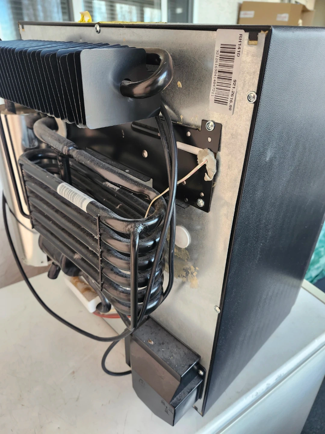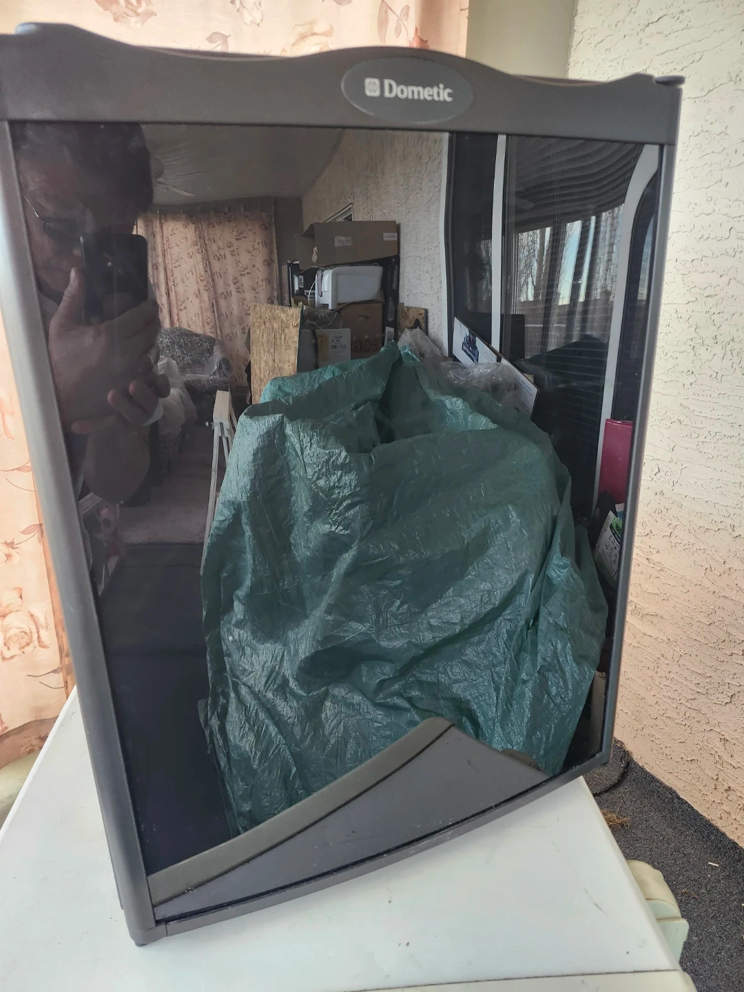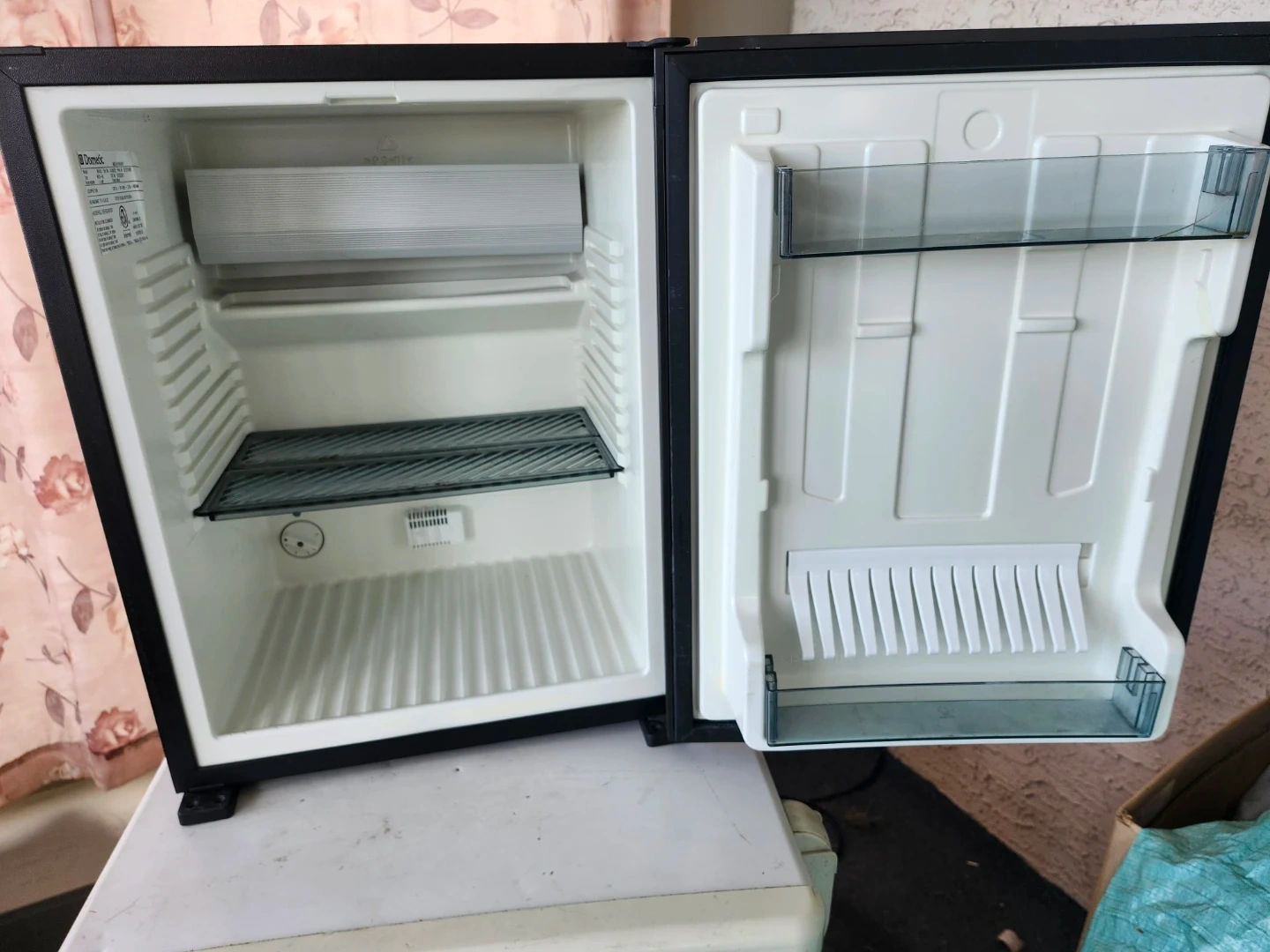 Selling a mini fridge by Dometic. It's in good condition and perfect for a dorm room, office, or small space. It has a black exterior and a white interior with adjustable shelves in the door.