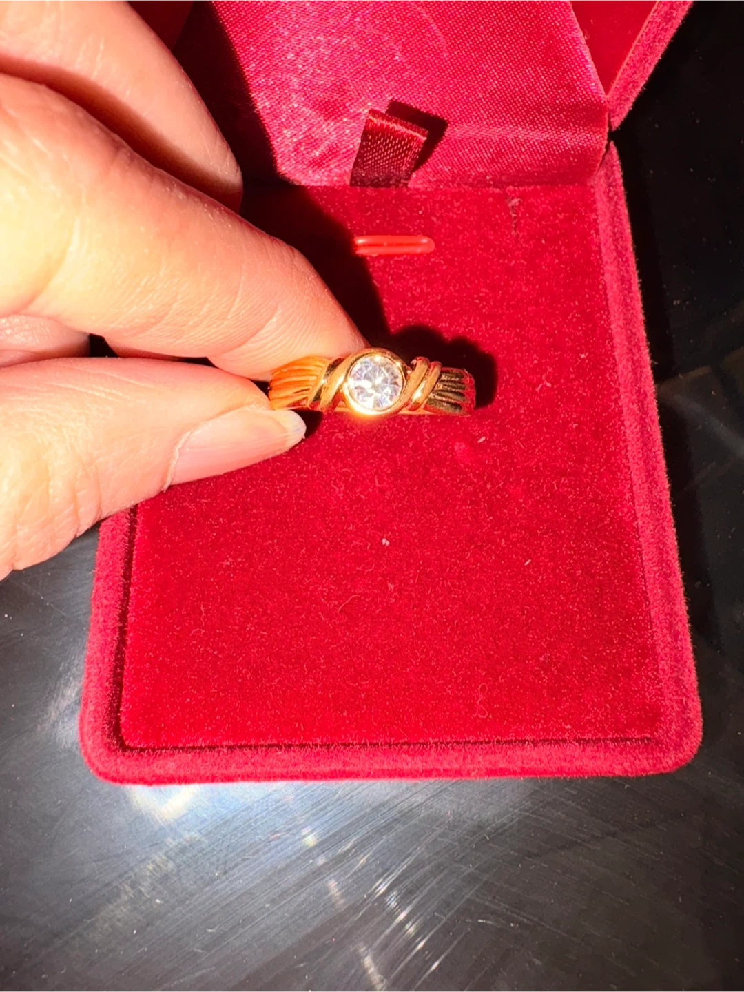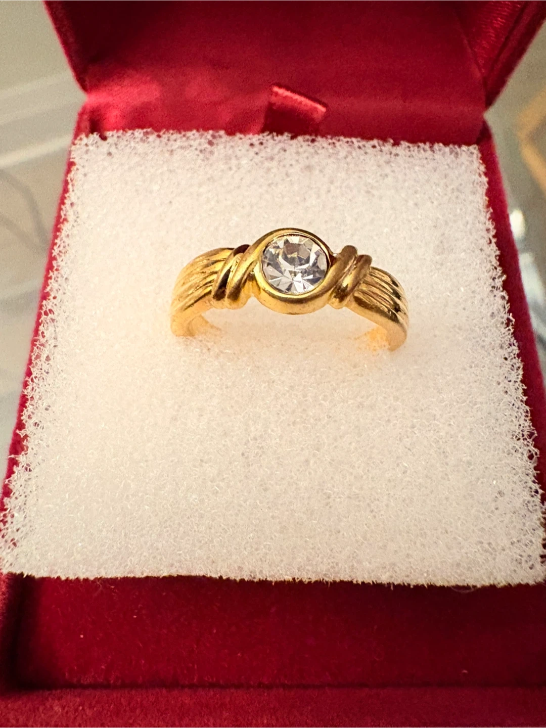 Selling a lovely gold ring featuring a clear stone. It's a size 7 and comes in a red box. The ring is in great condition and ready to wear! New It is not my size.