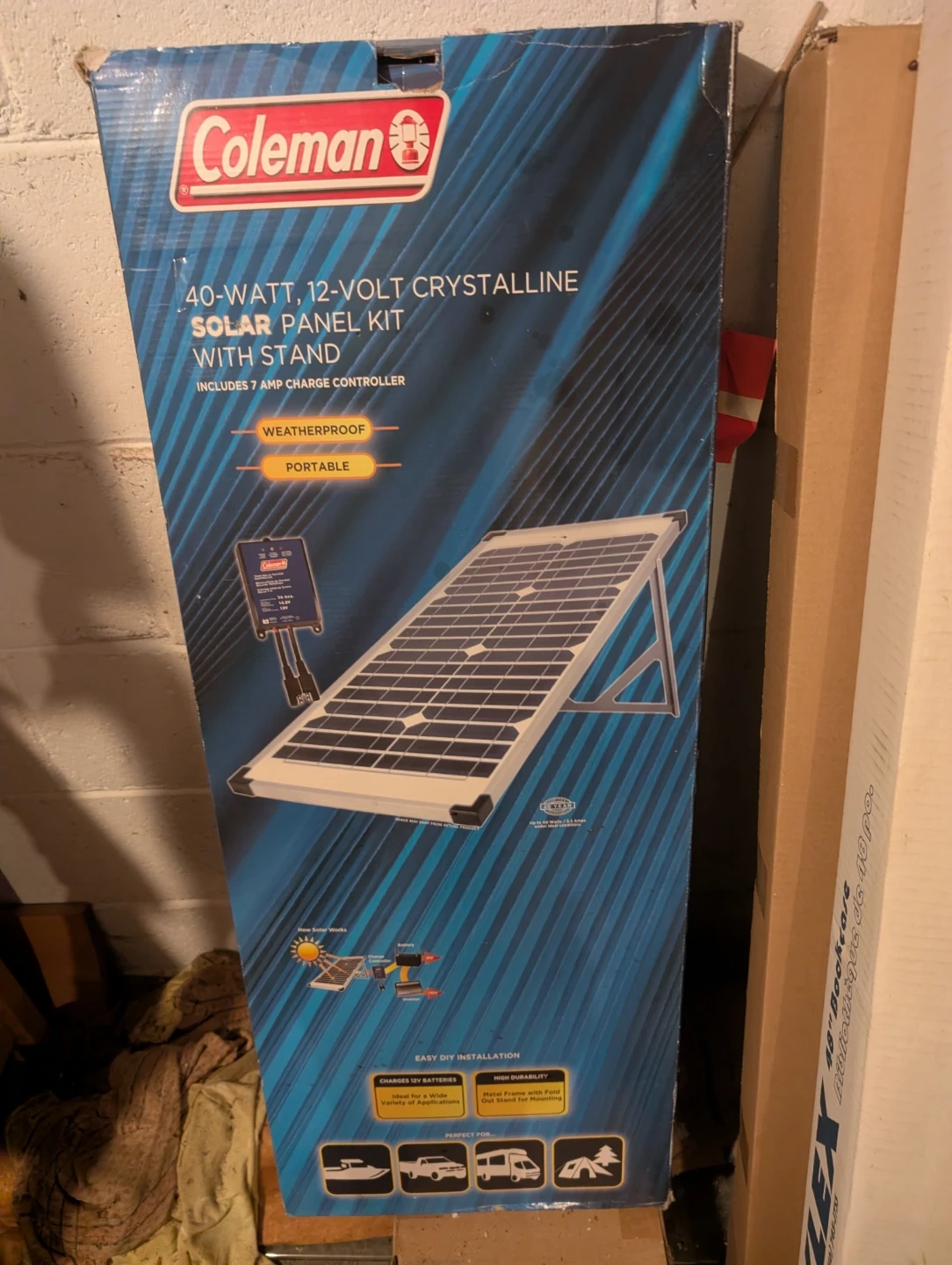 Selling a Coleman 40-Watt, 12-Volt Crystalline Solar Panel Kit with Stand! It includes a 7 amp charge controller. It's weatherproof and portable, perfect for charging 12V batteries. The metal frame has a fold-out stand for easy mounting.