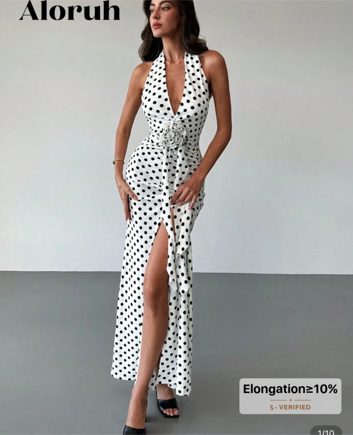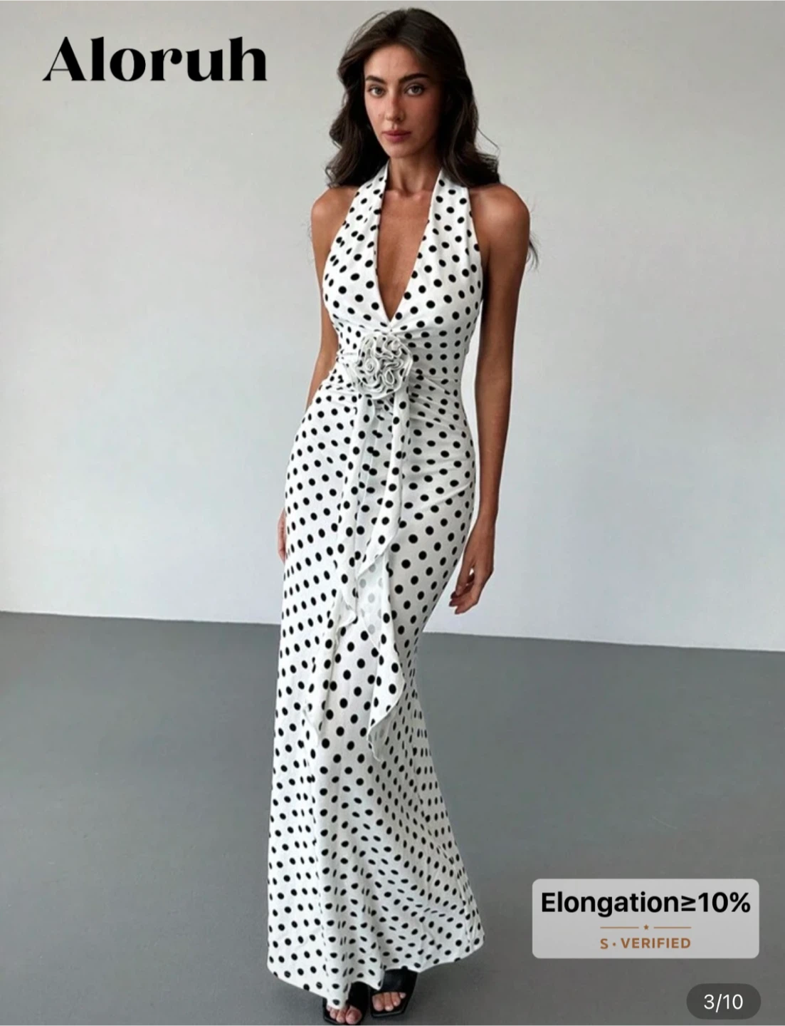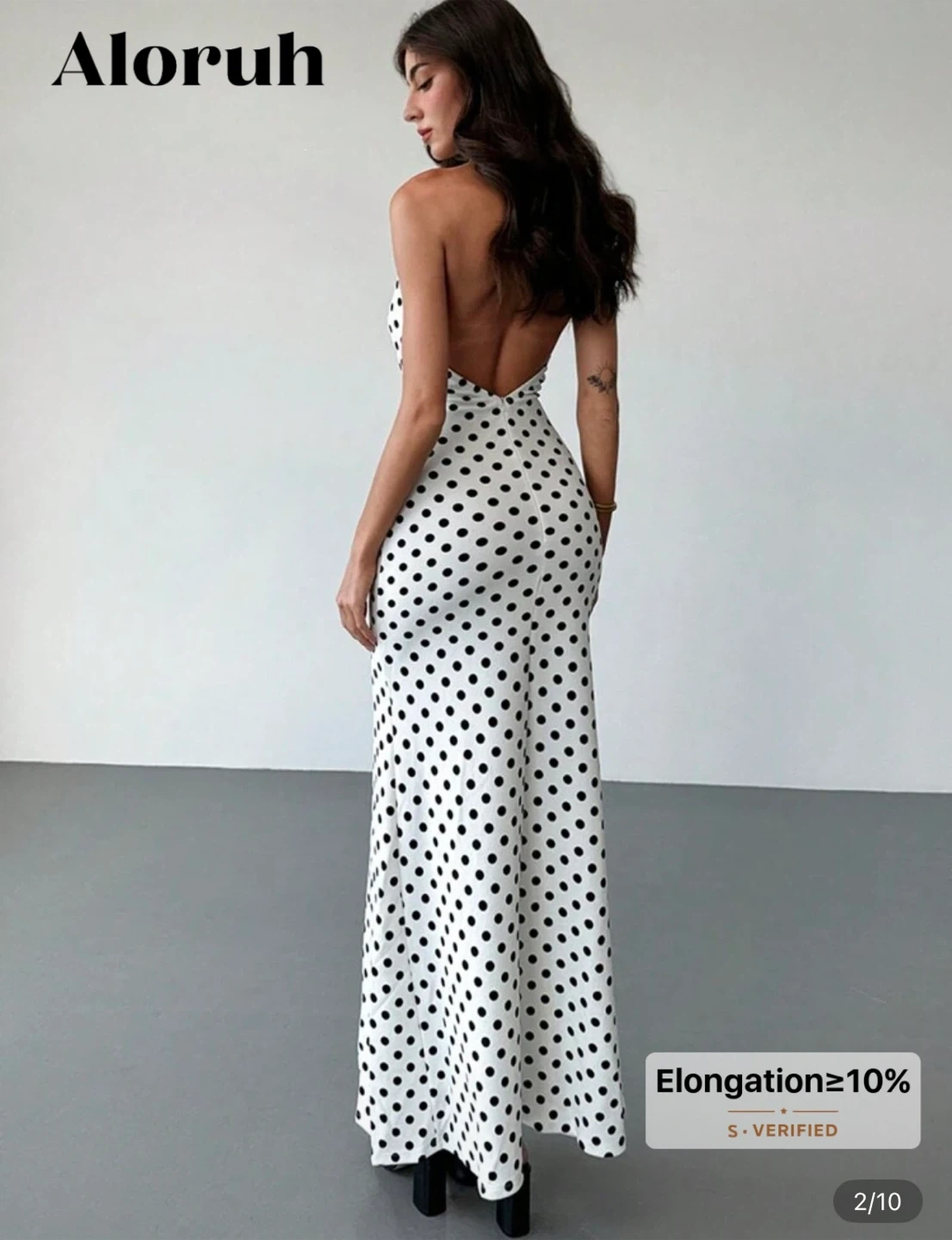 This is an Aloruh polka dot halter maxi dress. It features a halter neckline and a flowing maxi length. The dress has a stylish polka dot pattern, perfect for any occasion!