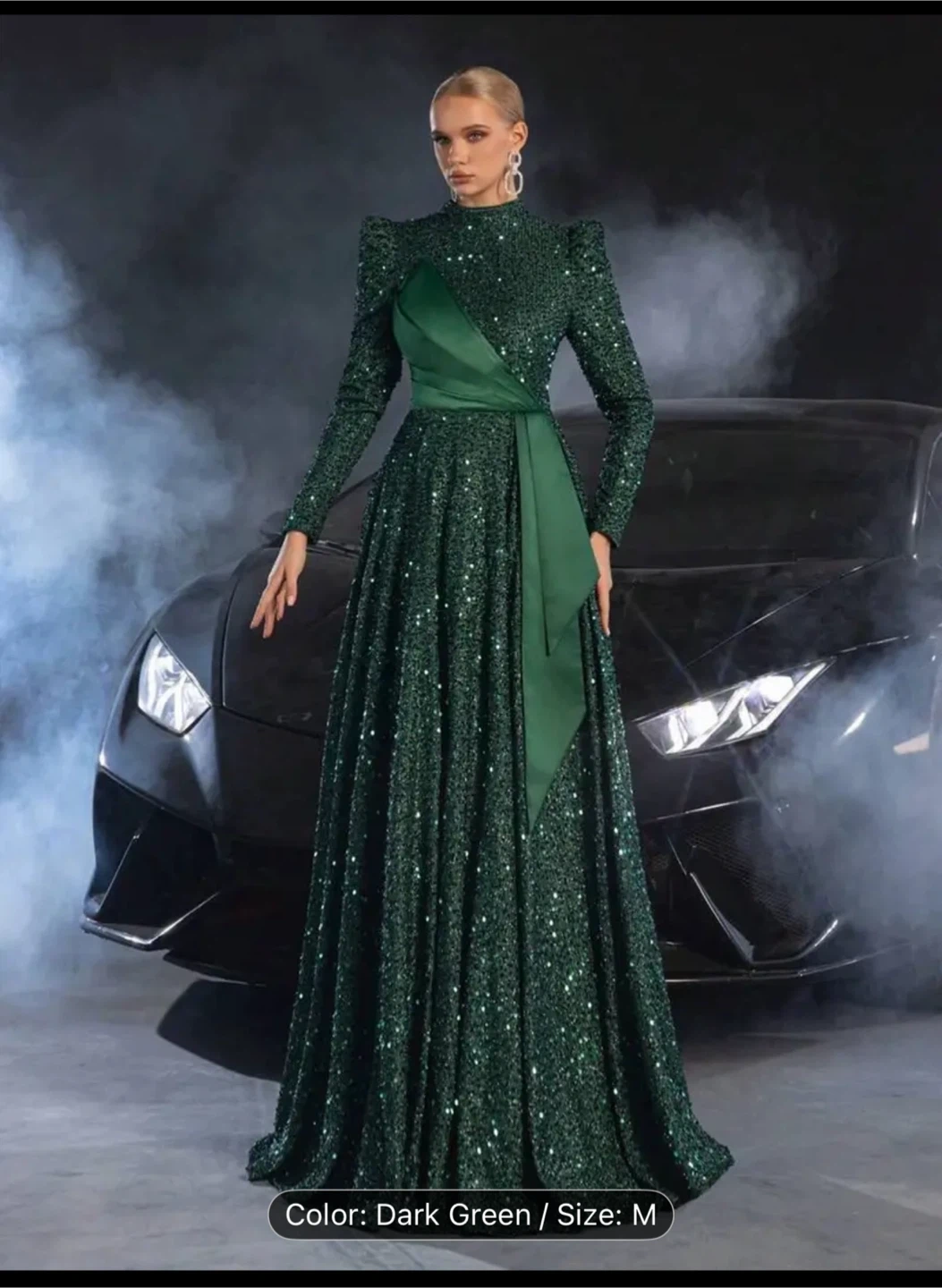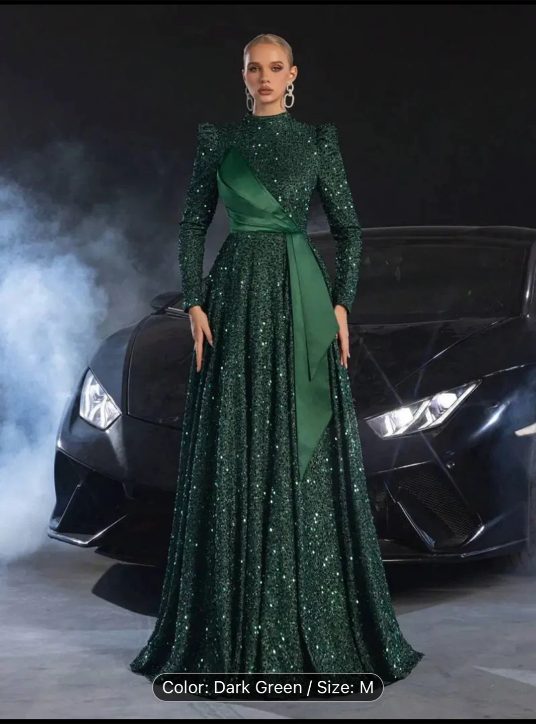 Selling a beautiful dark green sequin maxi dress in size M. It features long sleeves and a stylish sash detail. Perfect for a special occasion!