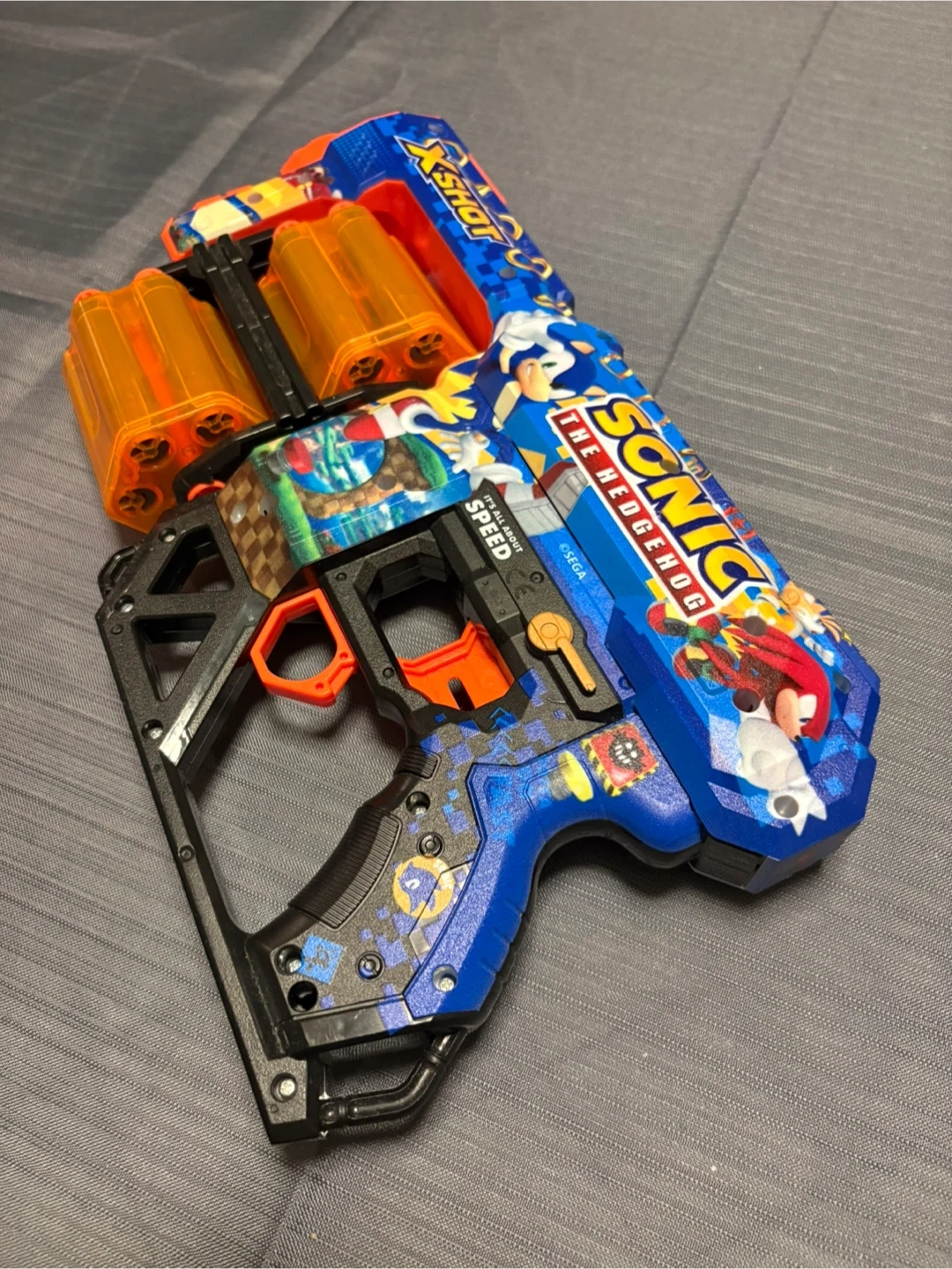 Selling an X-Shot blaster featuring Sonic the Hedgehog! It's in great condition and ready for some fun. Perfect for Sonic fans and blaster enthusiasts alike