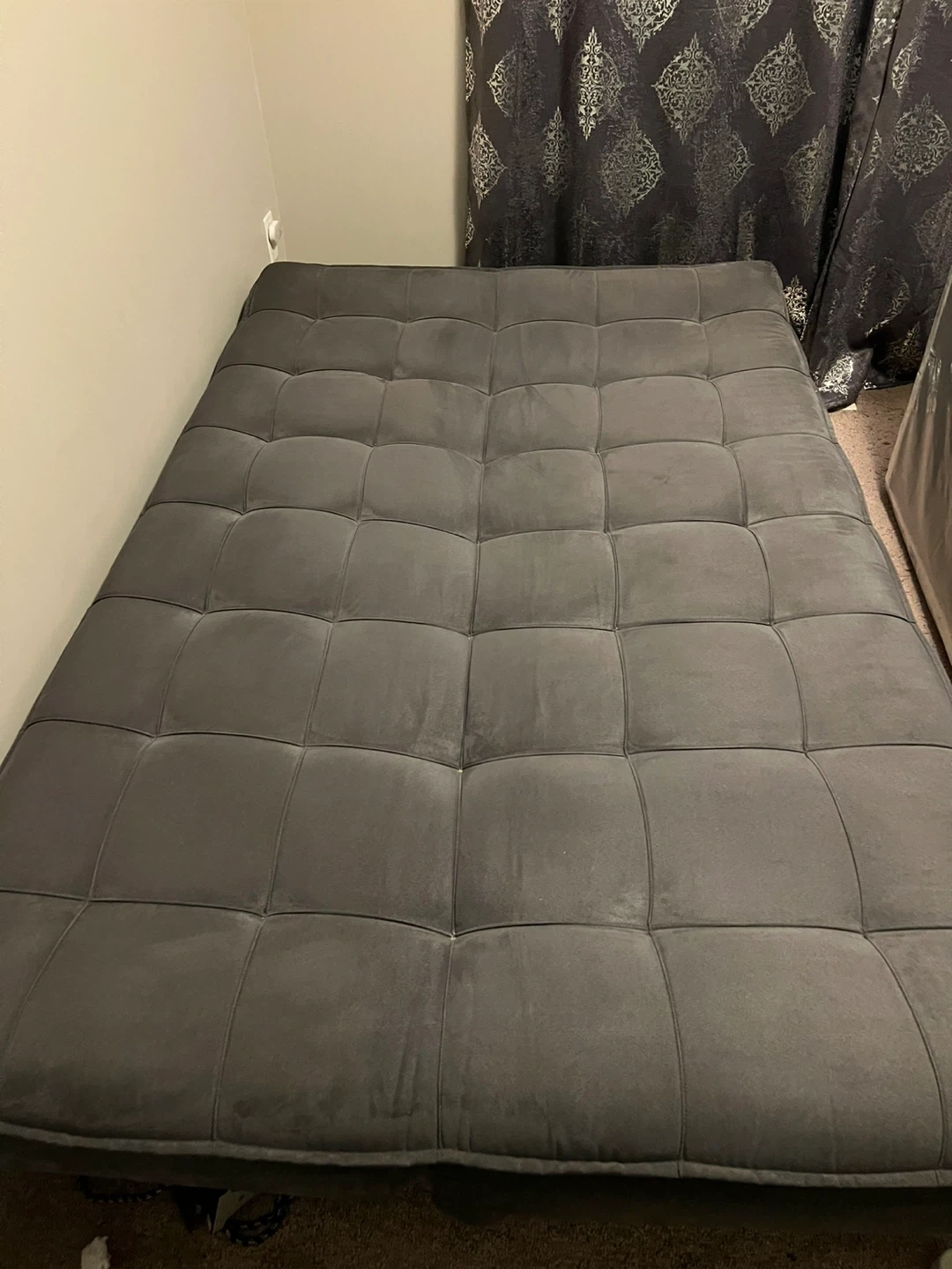 Selling a grey futon. It's in good condition and perfect for a living room or spare bedroom. It can be used as a couch or folded down into a bed.
